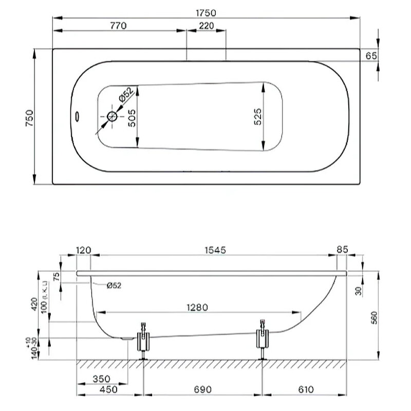 - Размер чаши ванны (ШхВхД): 750х420х1750 мм.