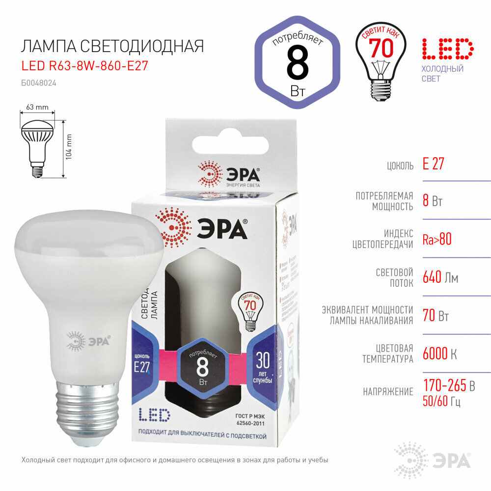 Лампа светодиодная ЭРА E27 8W 6000K матовая Б0048024 LED R63-8W-860-E27