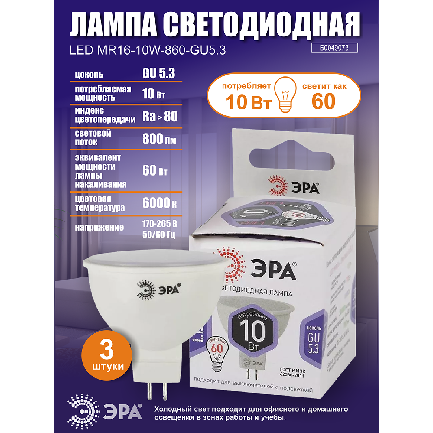 Лампа светодиодная ЭРА GU5.3 10W 6000K матовая Б0049073 LED MR16-10W-860-GU5.3