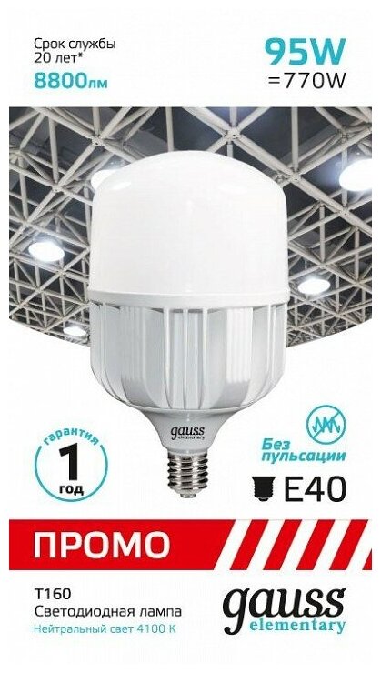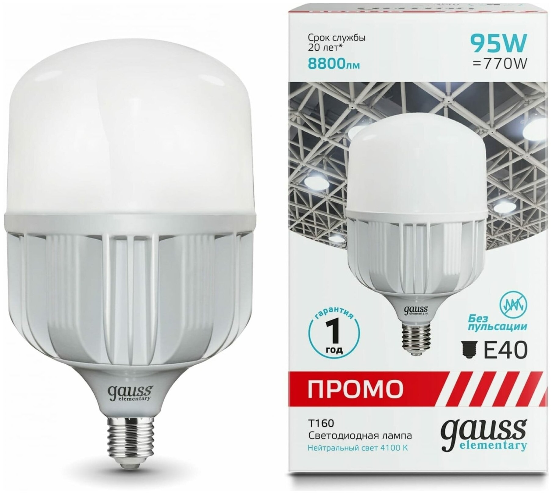 Светодиодные лампы высокой мощности в основном используются в освещении помещений большой площади и высокими потолками (от 3,5 метров), а также уличных системах освещения. Высокая мощность и большой световой поток при минимальном энергопотреблении - Gauss Т100-Т160.