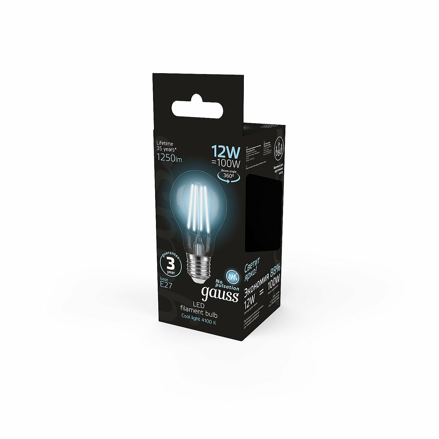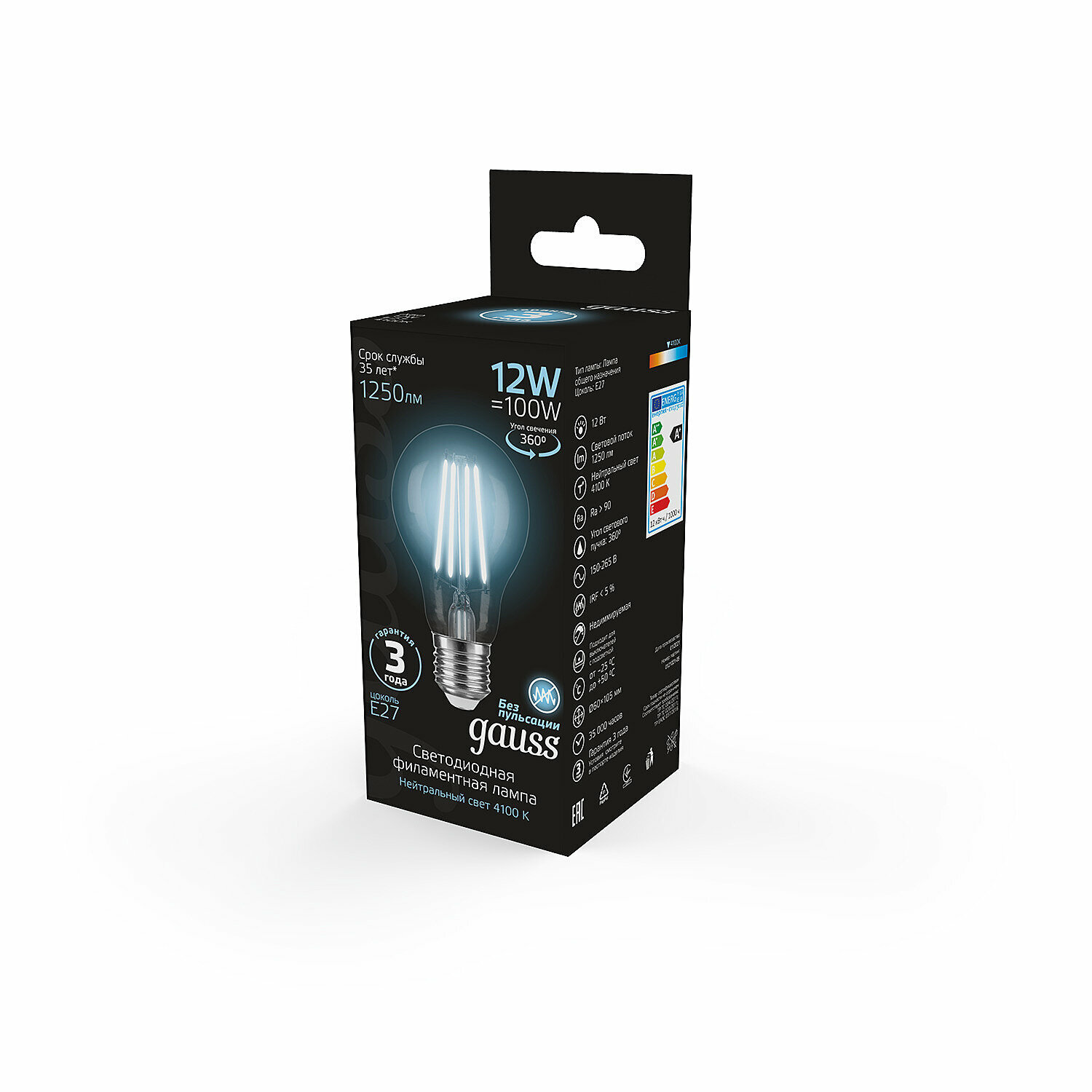 Лампа светодиодная филаментная Gauss E27 12W 4100K прозрачная 102902212