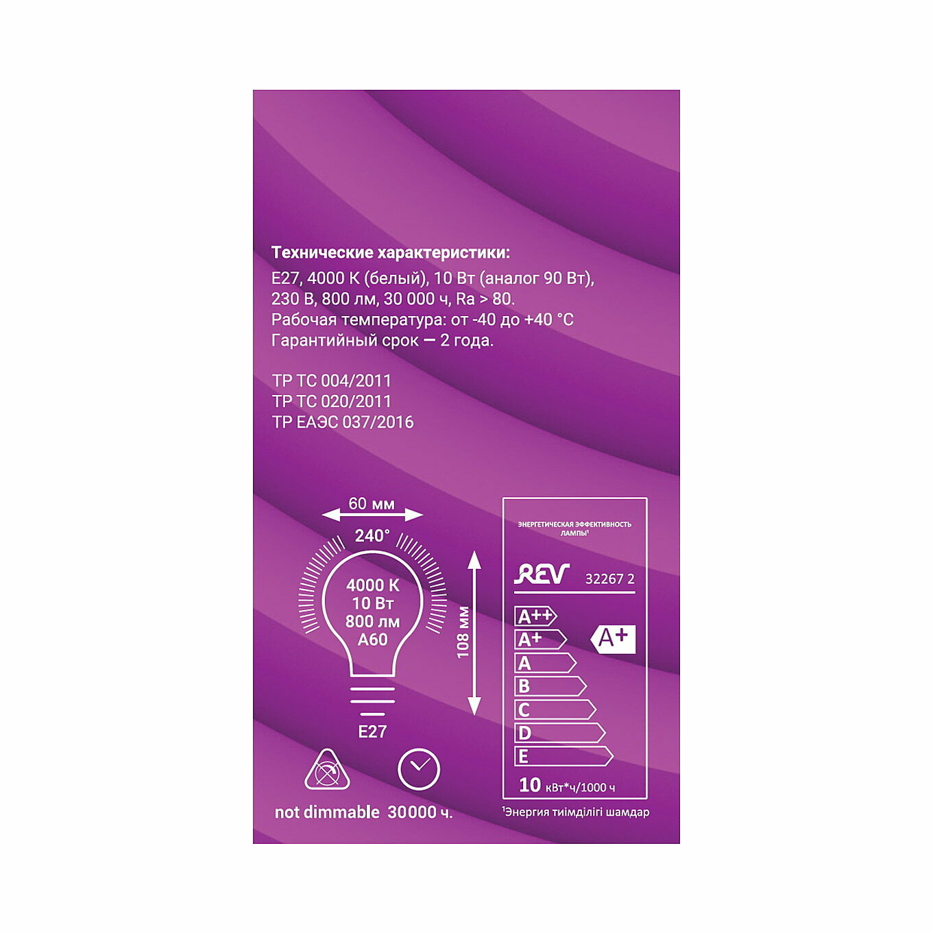 | Тип лампочки (основной) | Светодиодная |