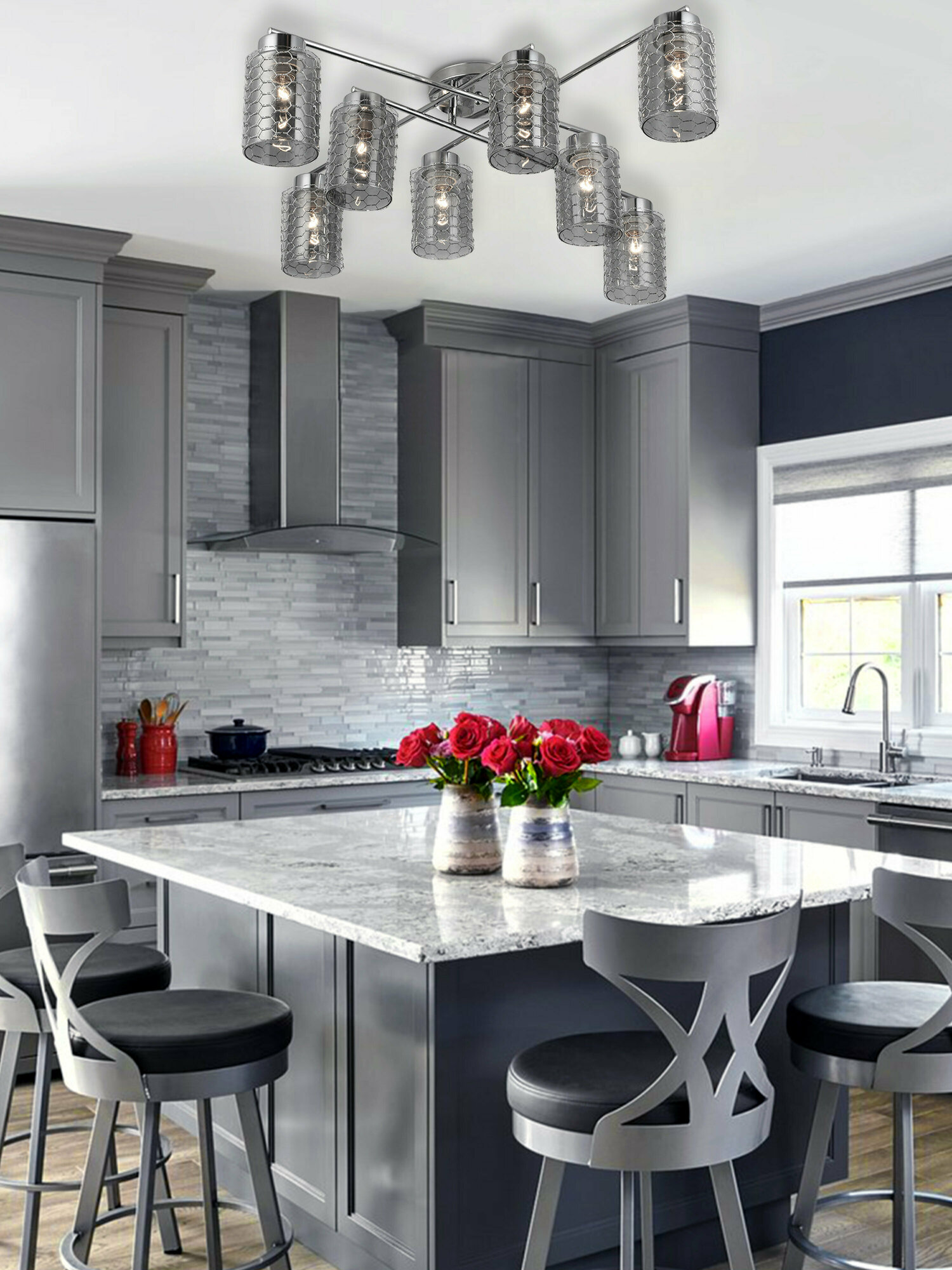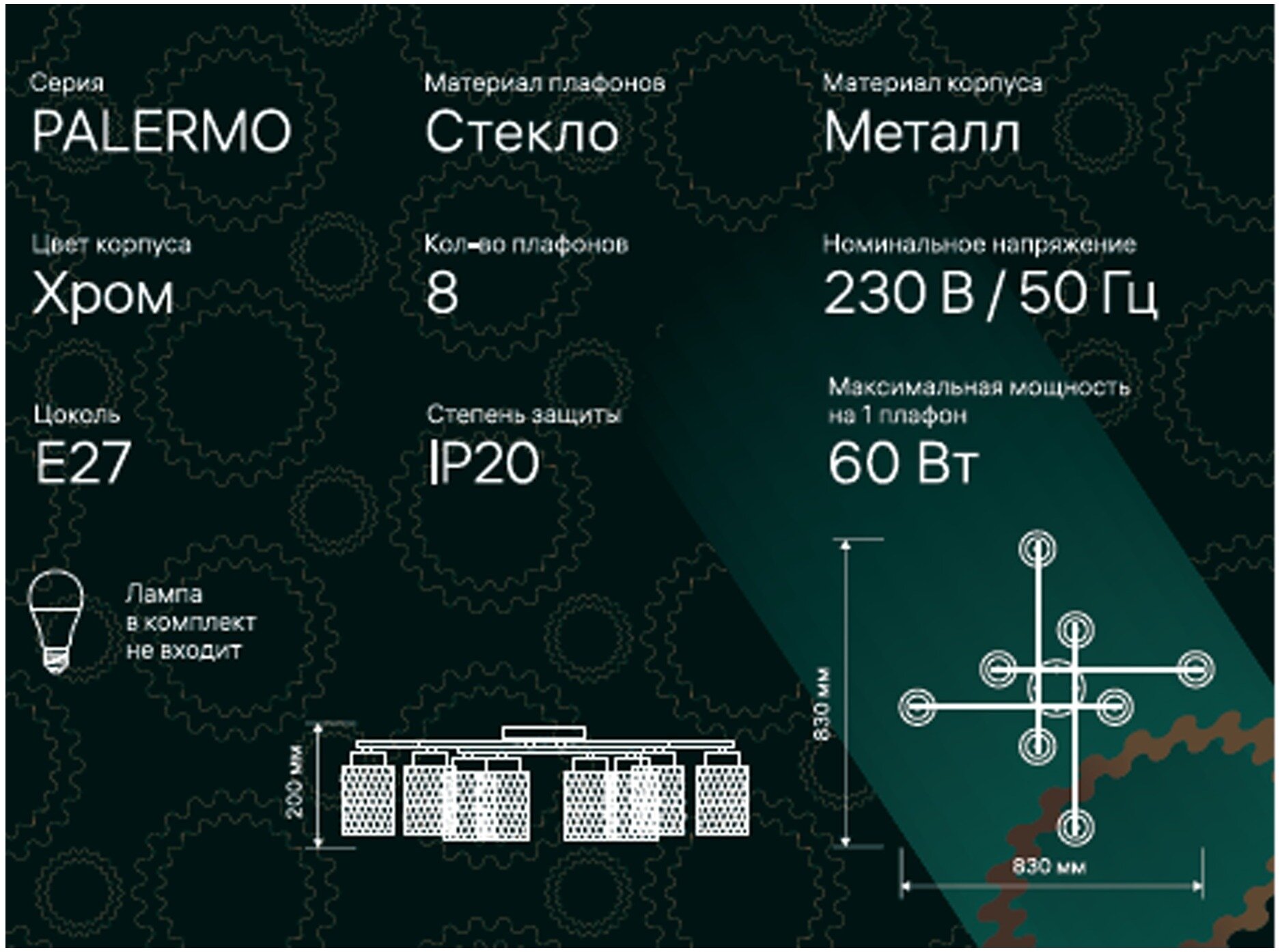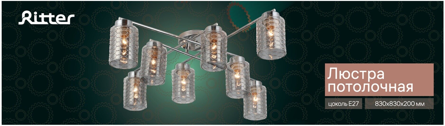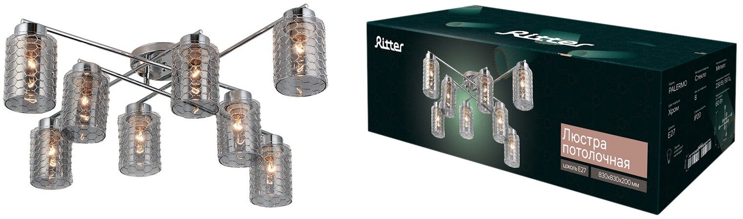 Потолочная люстра Ritter серии PALERMO со стандартным цоколем E27 для светодиодных ламп или ламп накаливания. Надежное металлическое основание и классические плафоны из стекла - для равномерного освещения жилых помещений. Оригинальное расположение и дизайн плафонов не позволят люстре затеряться в интерьере. Она станет завершающим штрихом пространства в стиле «модерн» или вдохновит на новые дизайнерские свершения. Кол-во плафонов: 8. Цоколь: E27. Цвет корпуса: хром. Материал корпуса: металл. Материал плафонов: стекло. Макс. мощность на 1 плафон 60 Вт. Напряжение 230 В / 50 Гц. Размер: 830х830х200 мм