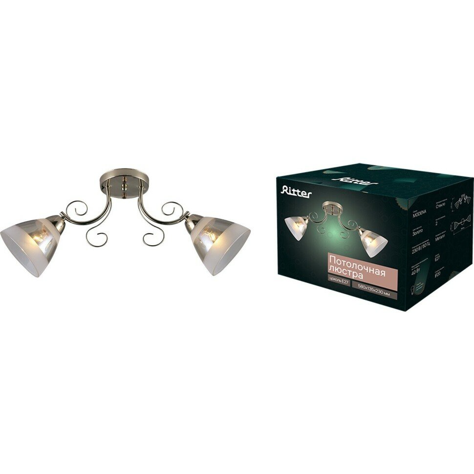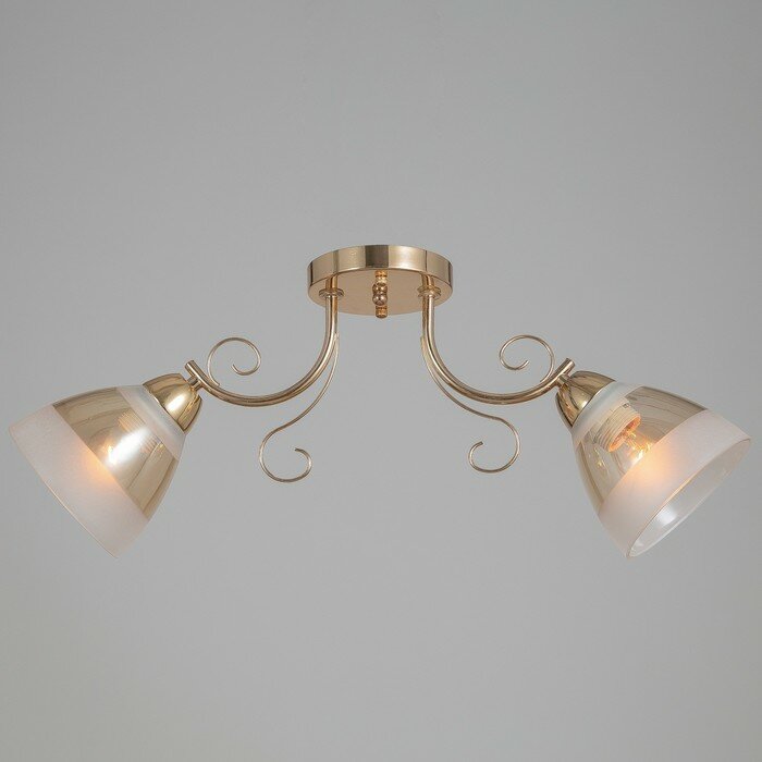 Потолочная люстра серии MODENA на два плафона предназначена для общего освещения. Выполнена в золотистом металлическом корпусе со стеклянными полупрозрачными плафонами. Стандартный цоколь Е27 позволяет использовать светодиодные лампы и лампы накаливания до 40 Вт. Люстра прекрасно дополнит интерьер, выполненный в классическом или эклектичном стиле, украсит кухню, спальню или детскую. Плафоны в виде колокольчиков станут романтичным штрихом вашего помещения. Надежность и качество материалов обеспечат комфортную и долгую эксплуатацию. Количество плафонов: 2. Цоколь: E27. Цвет корпуса: золото. Материал корпуса: металл. Материал плафона: стекло . Максимальная мощность на 1 плафон 40 Вт. Напряжение 230 В / 50 Гц. Размер: 580х135х230 мм