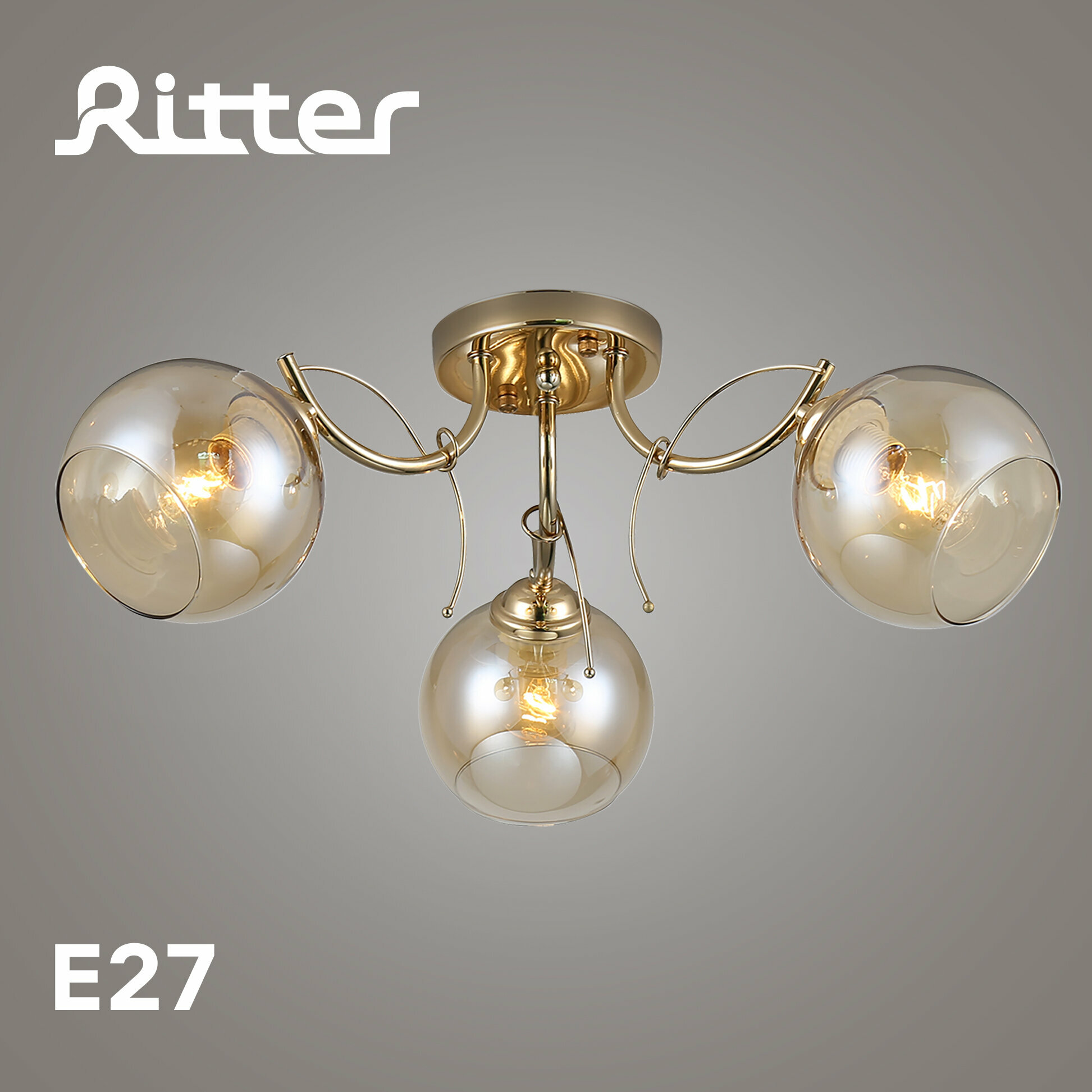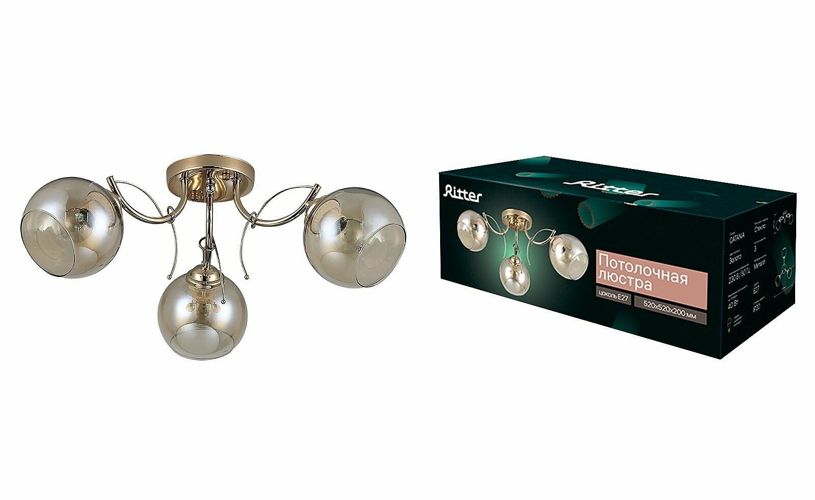Потолочная люстра Ritter серии CATANIA со стандартным цоколем E27 для светодиодных ламп или ламп накаливания. Надежное металлическое основание и классические плафоны из стекла - для равномерного освещения жилых помещений. Оригинальное расположение и дизайн плафонов не позволят люстре затеряться в интерьере. Она станет завершающим штрихом пространства в стиле «модерн» или вдохновит на новые дизайнерские свершения. Кол-во плафонов: 3. Цоколь: E27. Цвет корпуса: золото. Материал корпуса: металл. Материал плафона: стекло. Макс. мощность на 1 плафон 40 Вт. Напряжение 230 В / 50 Гц. Размер: 520х520х200 мм