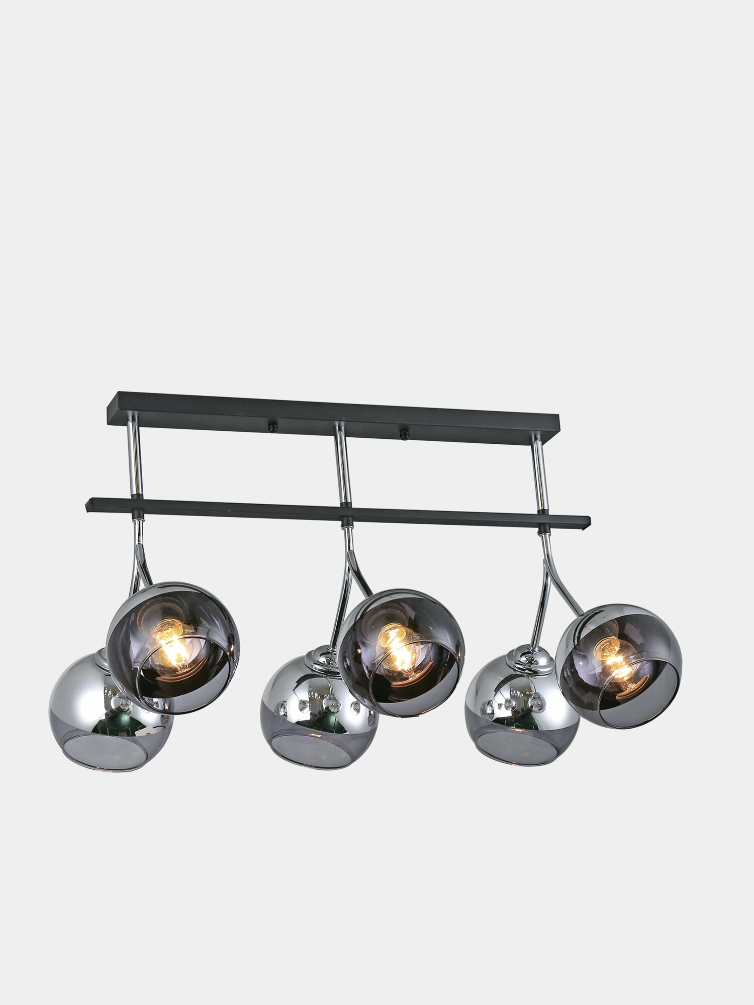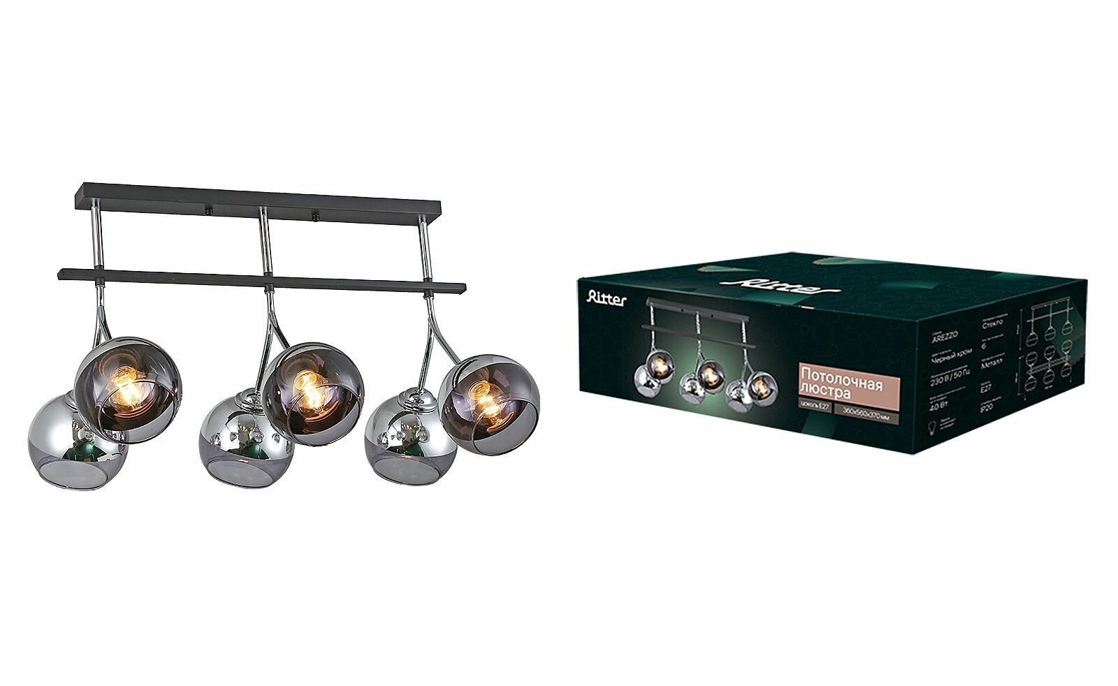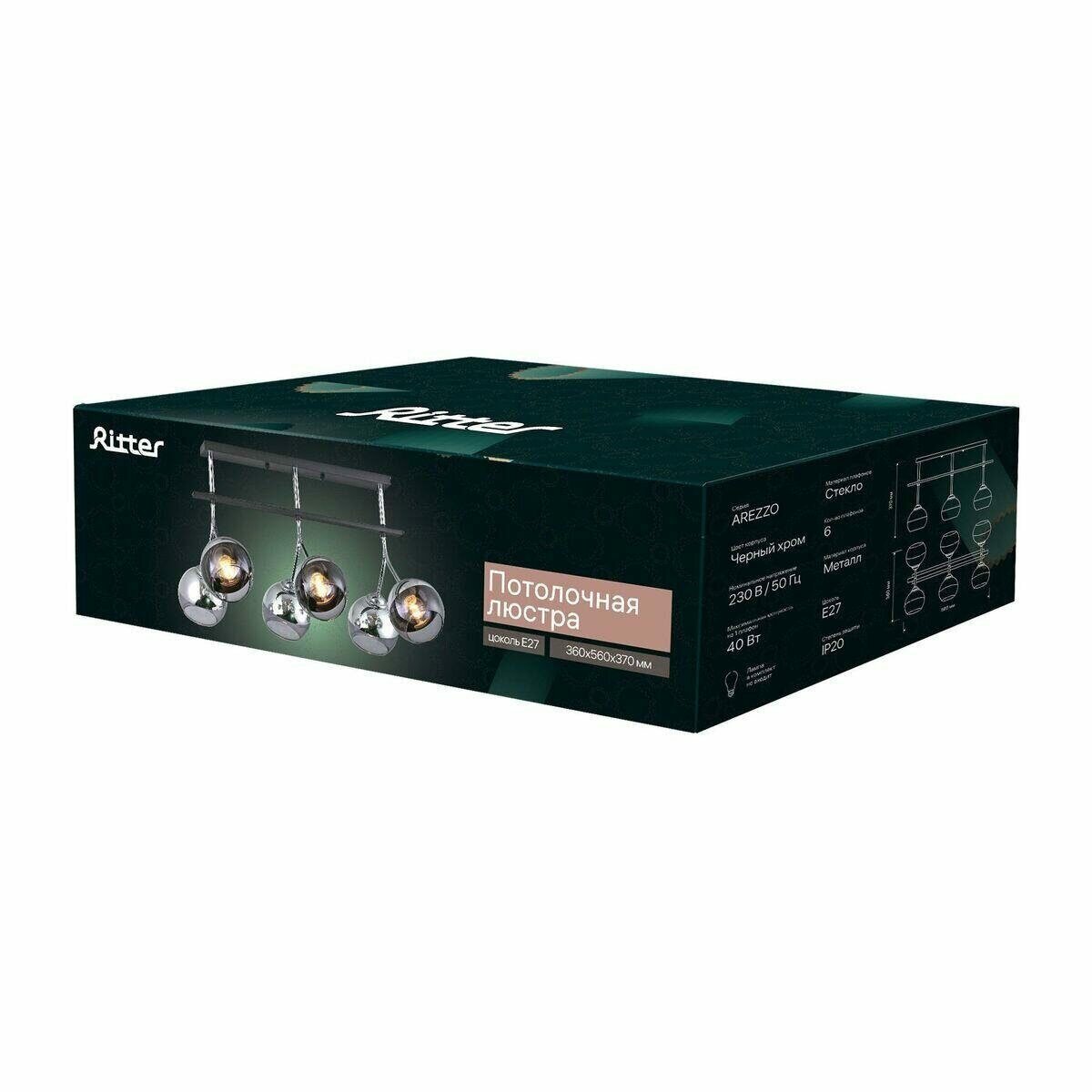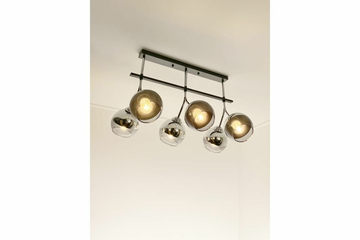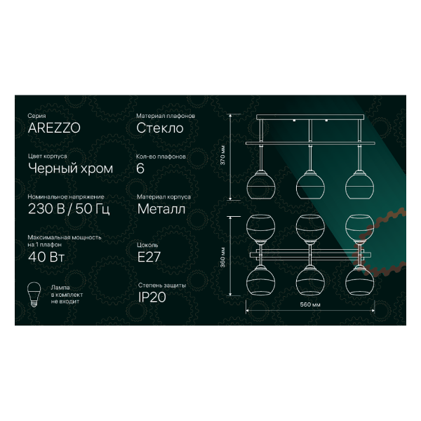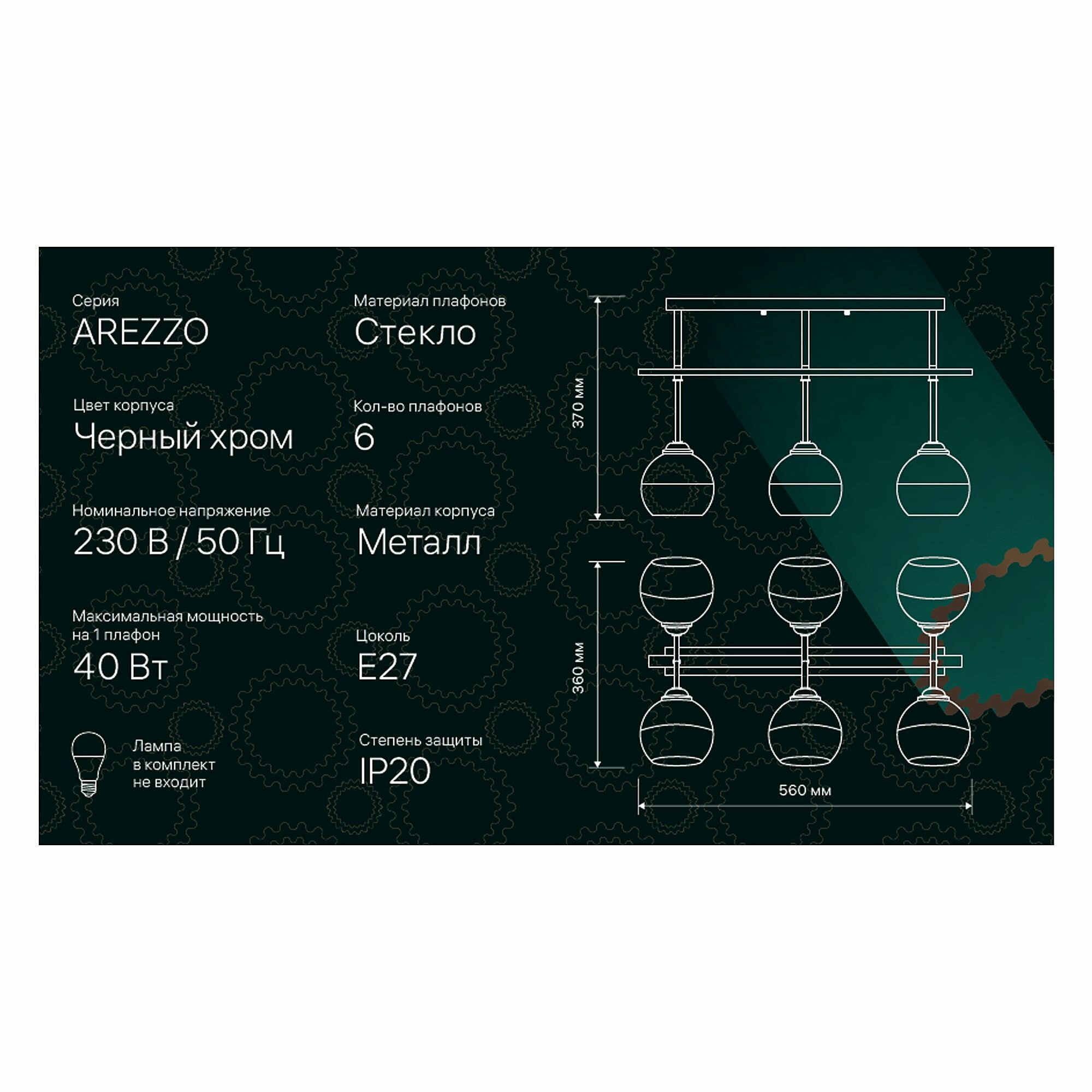 Потолочная люстра серии AREZZO на шесть плафонов предназначена для общего освещения. Выполнена в металлическом корпусе со стеклянными плафонами, цвет "черный хром". Стандартный цоколь Е27 позволяет использовать светодиодные лампы и лампы накаливания до 40 Вт. Люстра прекрасно дополнит интерьер, выполненный в стиле модерн, хай-тек или эклектика, станет центром притяжения взглядов в столовой или гостиной. Надежность и качество материалов обеспечат комфортную и долгую эксплуатацию. Количество плафонов: 6. Цоколь: E27. Цвет корпуса: черный хром. Материал корпуса: металл. Материал плафонов: стекло. Максимальная мощность на 1 плафон 40 Вт. Напряжение 230 В / 50 Гц. Размер: 360х560х370 мм.