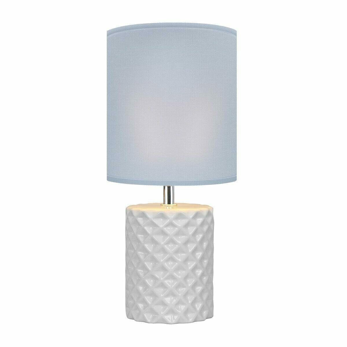 Настольный светильник имеет лаконичный дизайн в стиле “минимализм” и классические формы плафона и основания. Эта особенность позволяет удачно вписать его в любой интерьер современного жилья. Конструкция лампы состоит из керамического основания в виде цилиндра с рельефным рисунком, тканевого плафона, патрона и сетевого провода.