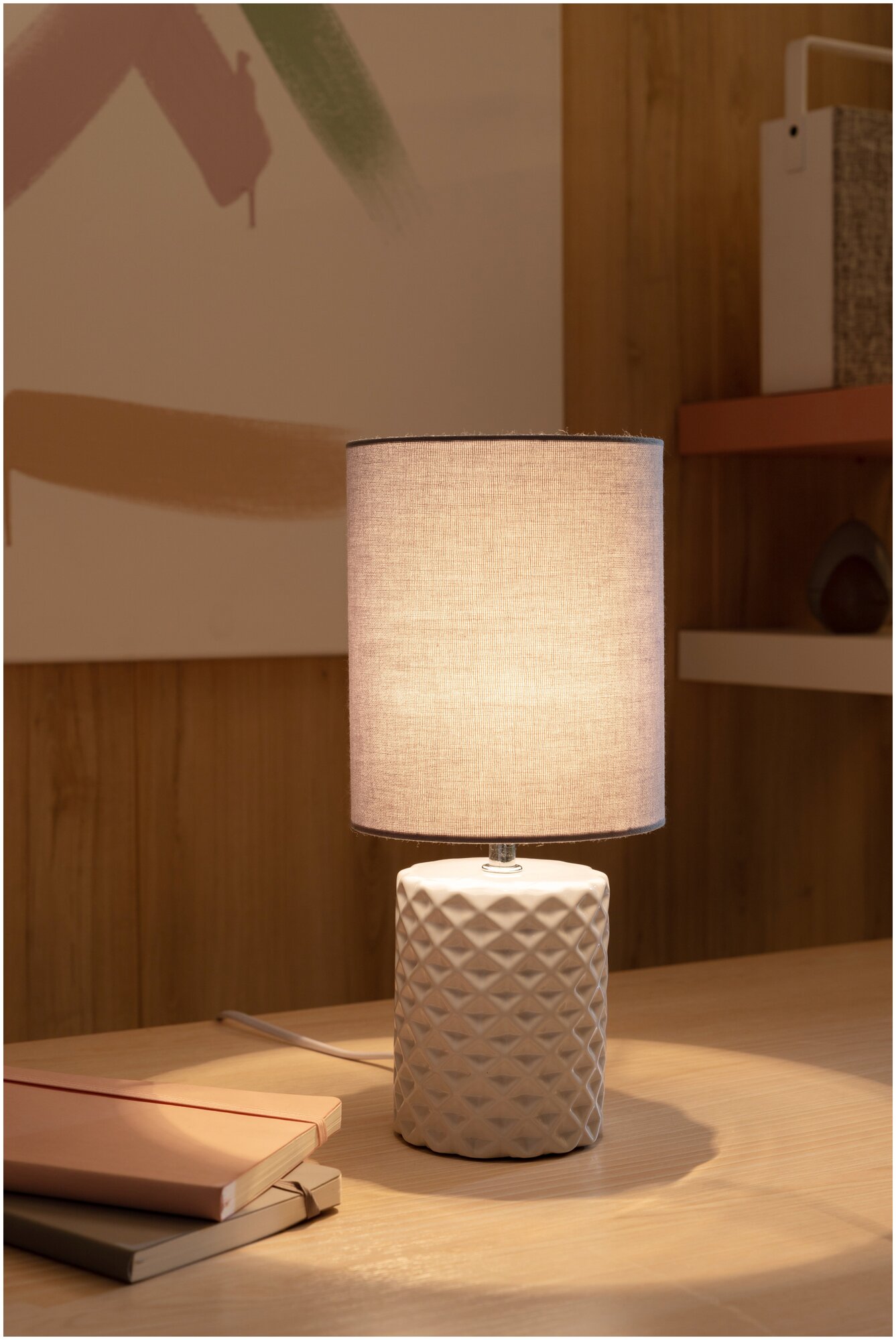 Главной особенностью светильника являются натуральные материалы и утончённый стиль. Белое керамическое основание с геометрическим декором подчеркнет неповторимость интерьера комнаты, а тканевый плафон кофейного цвета создаст особую атмосферу в спальне. Настольный светильник можно использовать в качестве ночника.