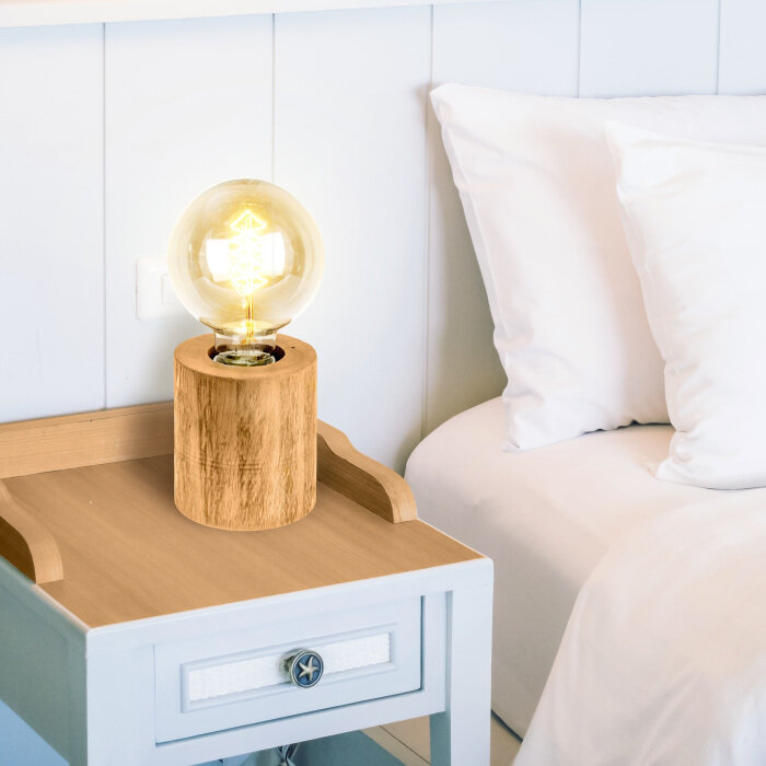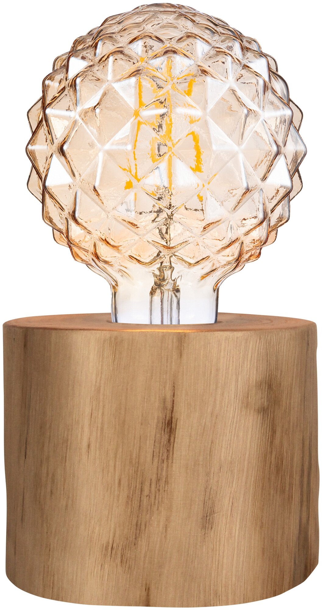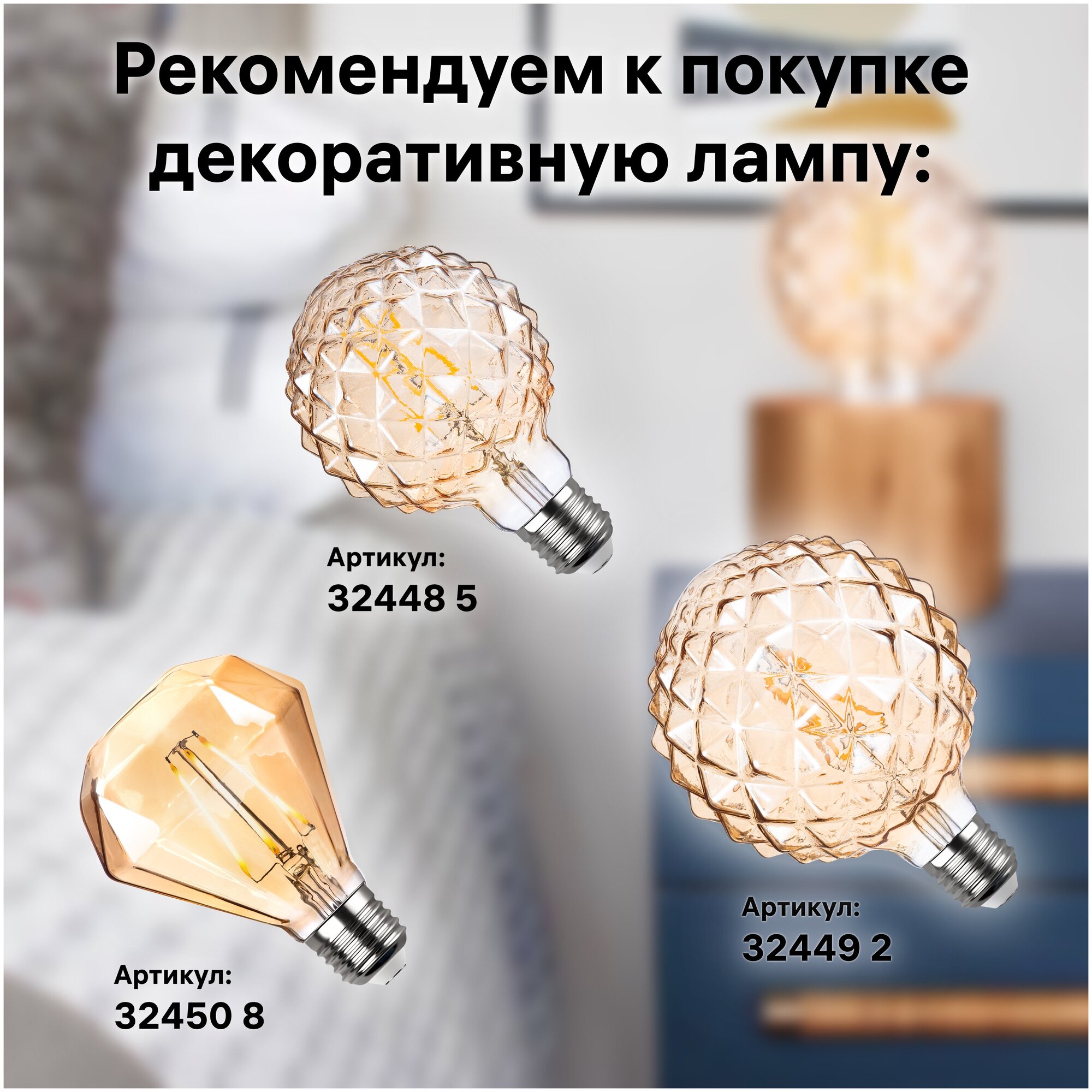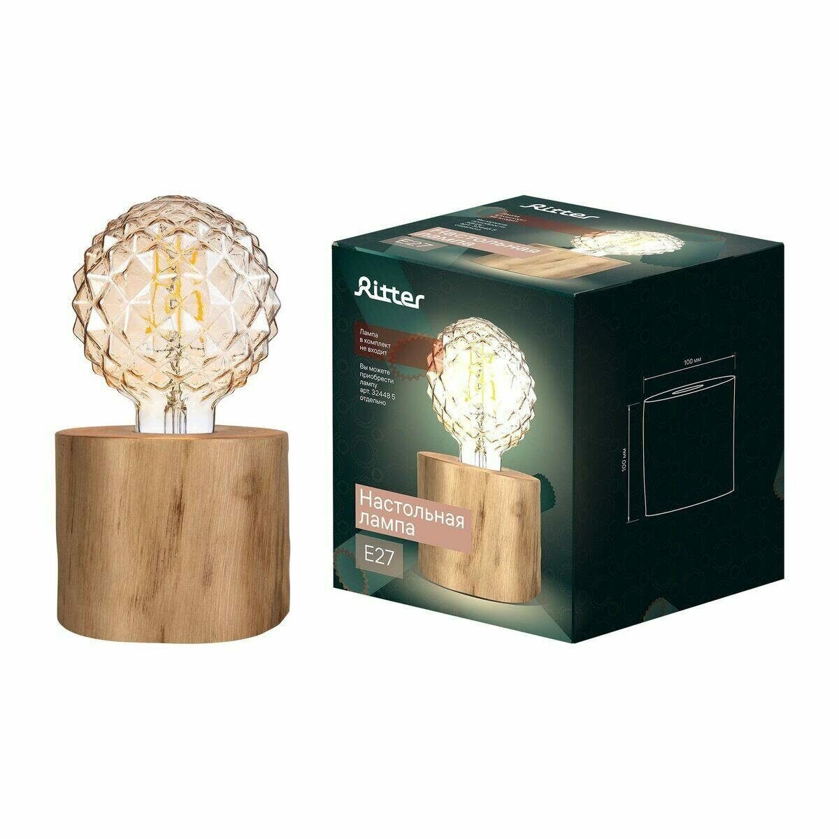 Настольный светильник имеет эко-дизайн и оригинальную форму основания, что позволяет удачно вписать его в любой интерьер современного жилья, особенно дач и частных домов. Конструкция лампы состоит из деревянного основания, патрона и сетевого провода длиной 1,3 метра. Плафоном в светильнике является декоративная лампа, вкручиваемая вертикально в основание. Рекомендуем использовать филаментные лампы оригинальных форм по артикулам: 9964246, 9964247, 9964248.
