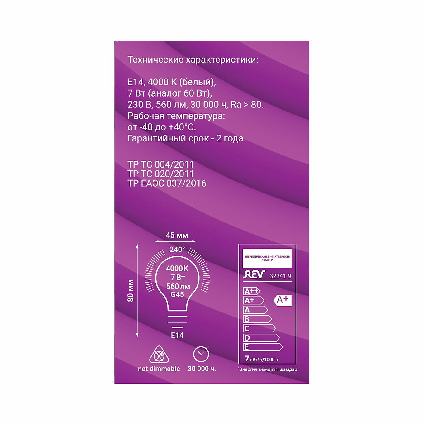Лампа светодиодная REV - это надежный источник света, который идеально подойдет для использования в вашем доме или офисе. Она имеет мощность 7Вт и обеспечивает приятный естественный свет с цветовой температурой 4000К. Эта лампа имеет форму груши и цоколь E14. Она прекрасно подойдет для потолочных светильников, бра и настольных ламп.Лампа REV имеет длительный срок службы (30 000 часов).Благодаря большому сроку службы, эта лампа станет незаменимым помощником в создании комфортного и безопасного освещения!