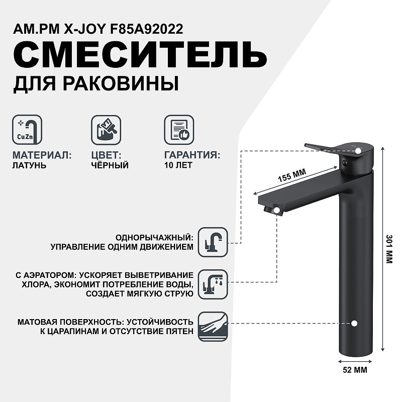Смеситель для раковины Am.Pm X-Joy с керамическим картриджем SoftMotion 35 мм, который обеспечивает оптимальную регулировку температуры, а также позволяет выдерживать любые перепады давления. Отдельная гарантия на корпус и покрытие – 10 лет в два раза больше чем принято по европейским стандартам.