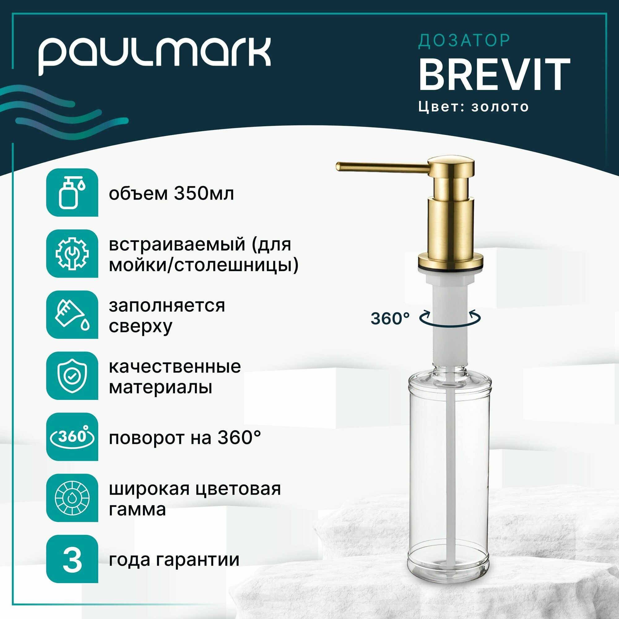 Встраиваемый кухонный дозатор Rein для моющего средства или антисептика от бренда Paulmark, изготовлен из латуни - это стильное и практичное решение для вашей кухни. Его объем составляет 350 мл, что позволяет хранить достаточное количество моющего средства для длительного использования.Кухонный диспенсер открывается сверху для заполнения, что позволяет легко и быстро добавлять моющее средство без необходимости снимать его с крепления или открывать снизу. Более того диспенсер Rein вращается на 360 градусов, что делает его максимально комфортным в использовании и функциональным.Благодаря качественным материалам, дозатор прочен, долговечен, не подвержен коррозии и сохраняет свой первоначальный вид на протяжении длительного времени, а надежная конструкция встраиваемого дозатора для кухни позволяет прекрасно справляется с повседневным использованием, не требуя особого ухода. Встраиваемый кухонный дозатор Rein от Paulmark – это функциональный и эстетически привлекательный элемент вашей кухни. Он легко интегрируется в любой стиль интерьера и обеспечивает удобный доступ к моющему средству во время приготовления пищи или мытья посуды. Благодаря широкой цветовой палитре, встраиваемый диспенсер легко подобрать в тон к кухонной мойке или смесителю бренда Paulmark.Встраиваемый дозаторRein от бренда Paulmark - это надежное и элегантное решение для вашей кухни, которое превратит ваши повседневные задачи в приятное и комфортное времяпровождение и добавит стиль и функциональность в ваш интерьер.