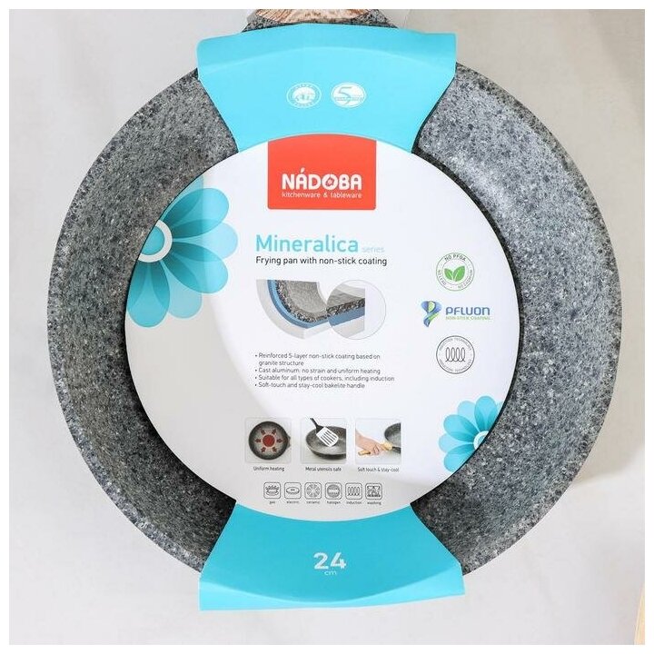 Сковорода Nadoba 728419 Mineralica изготовлена из литого алюминия с использованием особо прочного 5-слойного антипригарного покрытия Pfluon на основе структуры гранита с прекрасными антипригарными свойствами, прочностью и износостойкостью, благодаря чему посуда подходит для ежедневного использования и будет служить не один год. Антипригарное покрытие Pfluon не содержит PFOA, кадмий, свинец, а также любых других вредных веществ и полностью безопасно.