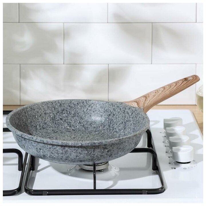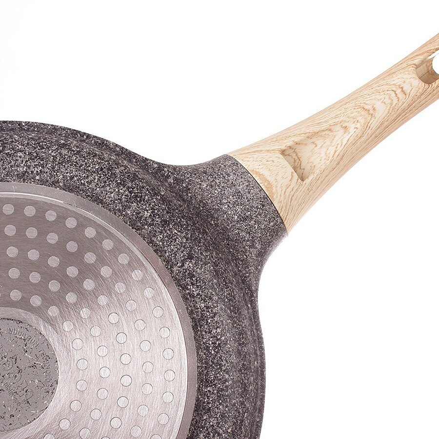 Корпус из литого алюминия. Надежное 5-слойное антипригарное покрытие Pfluon на основе структуры гранита внутри и снаружи сковороды. Покрытие без PFOA, полностью безопасно. Допустимо использование металлических инструментов. Ненагревающаяся ручка Софт-тач. Для всех типов плит. Гарантия 5 лет.