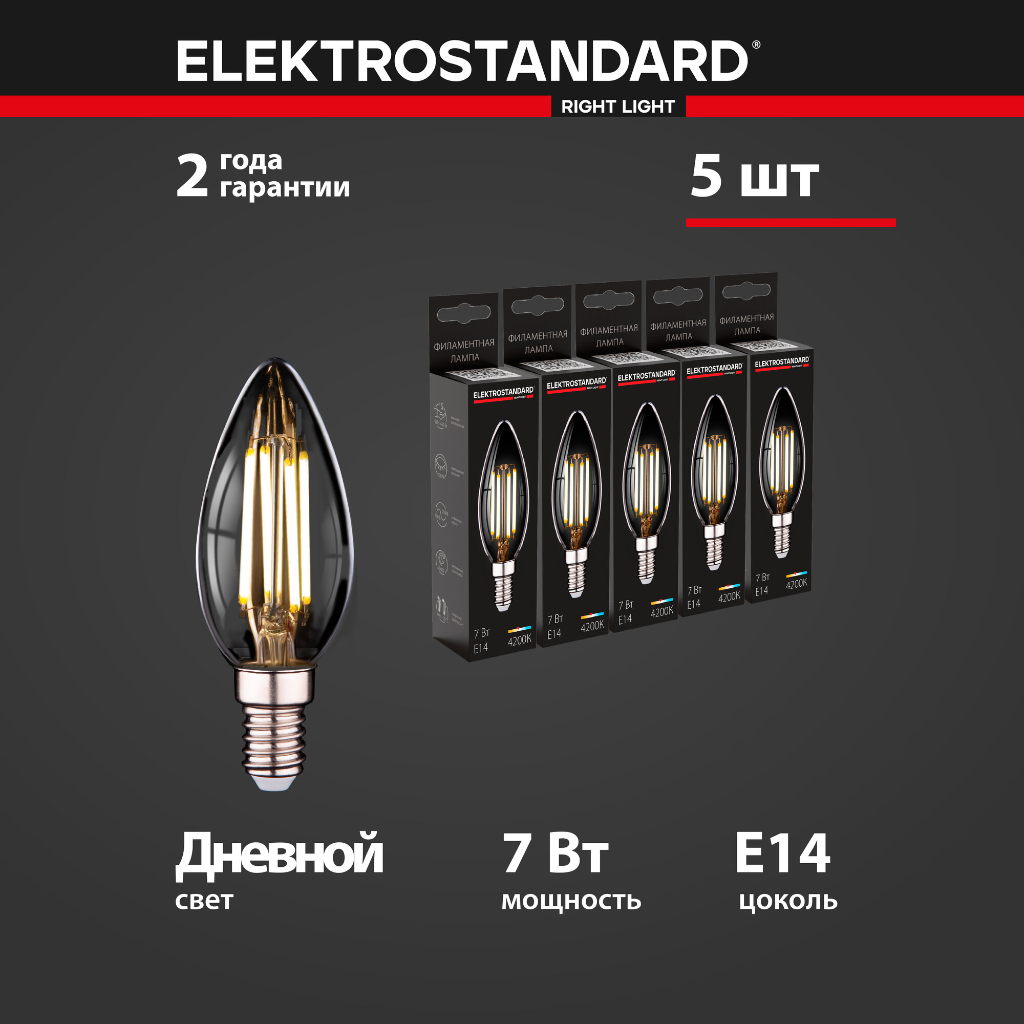 Филаментная светодиодная лампа Электростандарт "Свеча" С35 7W 4200K E14.Это вид светодиодных ламп, которые внешне максимально приближены к лампам накаливания. Они имеют полностью прозрачную стеклянную колбу и цоколь, а внутри расположены светодиоды вместо нити накала. Филаментная светодиодная лампочка с цоколем Е14 и размерами 98 мм по высоте и 35 мм в диаметре обладает мощностью 7W. Цветовая температура – 4200 К, т.е. естественный белый свет. Ориентировочный срок службы составляет 50000 ч. Изделие рассчитано на использование в сети с переменным напряжением в 220-240В.