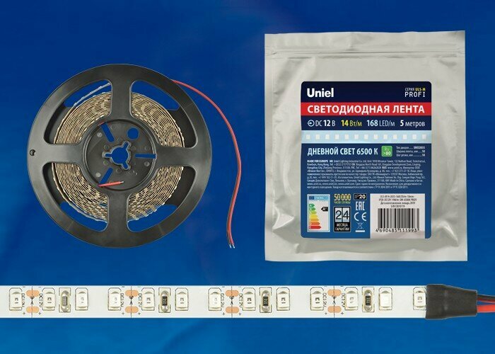 Светодиодная лента из серии «Профессиональная» от производителя Uniel (Китай). Дизайн-стиль современный. Отлично подойдет для такого типа помещений, как кафе и ресторан. Цвет товара черный. Используемые материалы: пластик. Цоколь LED. Вид ламп: светодиодная. Мощность одной лампы составляет 85 Вт. Напряжение 12 Вольт. Поток света 8500 Люмен. Уровень защищенности от влаги и пыли IP20. Заявленный производителем срок работы 50000 часов. Расширенная гарантия на товар 2 года. Длина 5000 мм. Ширина 10 мм. Вес товара 0.115 кг. Комплектация: Светодиодная лента. Инструкция по сборке/использованию. Детали, необходимые для сборки товара. Лампочки входят в комплект.Товар упакован в картонную коробку. В случае доставки транспортными службами или маркетплейсом добавляются дополнительные элементы упаковки для защиты от повреждений при транспортировке - усиление картоном, внутренний наполнитель, стрейч-пленка.