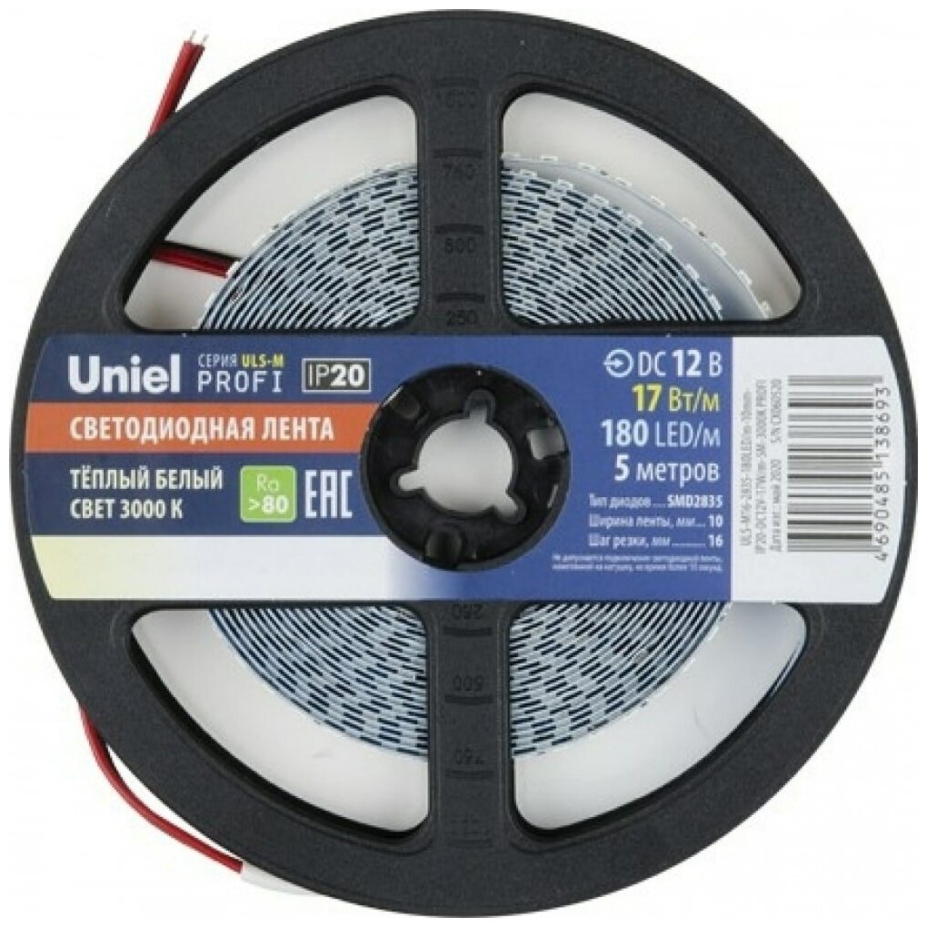 Светодиодная лента (UL-00007641) Uniel 17W/m 180LED/m 2835SMD дневной белый 5M ULS-M16-2835-180LED/m-10mm-IP20-DC12V-17W/m-5M-6500K Profi