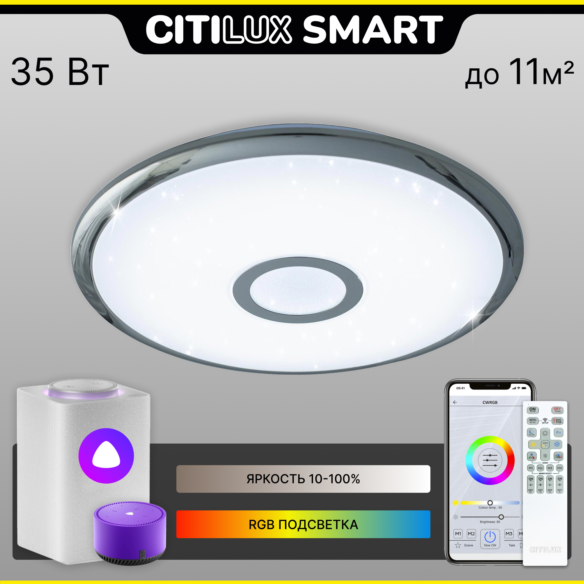 | Дополнительные характеристики | RGB-подсветка; голосовой помощник Алиса от Яндекса; изменение яркости и цветовой температуры; управление как с ПДУ, так и с приложения в телефоне |