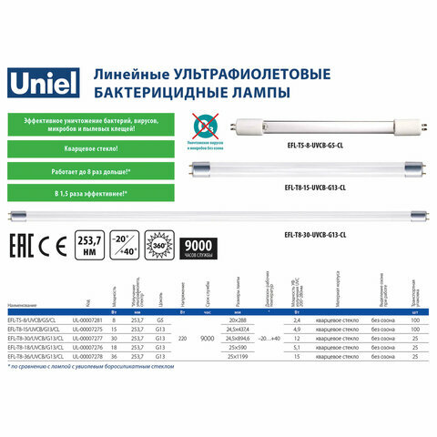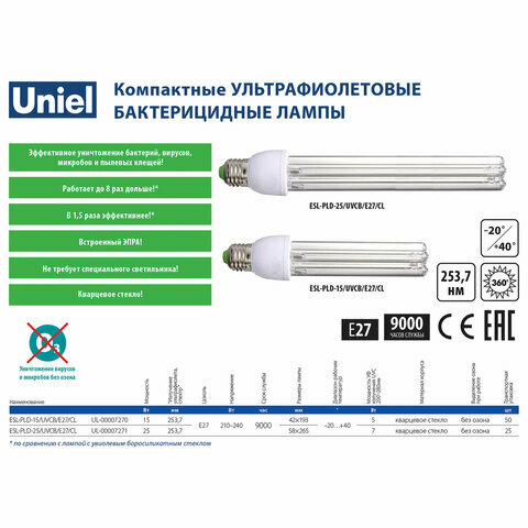 | Комплектация | Лампа БАКТЕРИЦИДНАЯ ультрафиолетовая UNIEL ESL-PL-9/UVCB, 9 Вт, 2G7 |