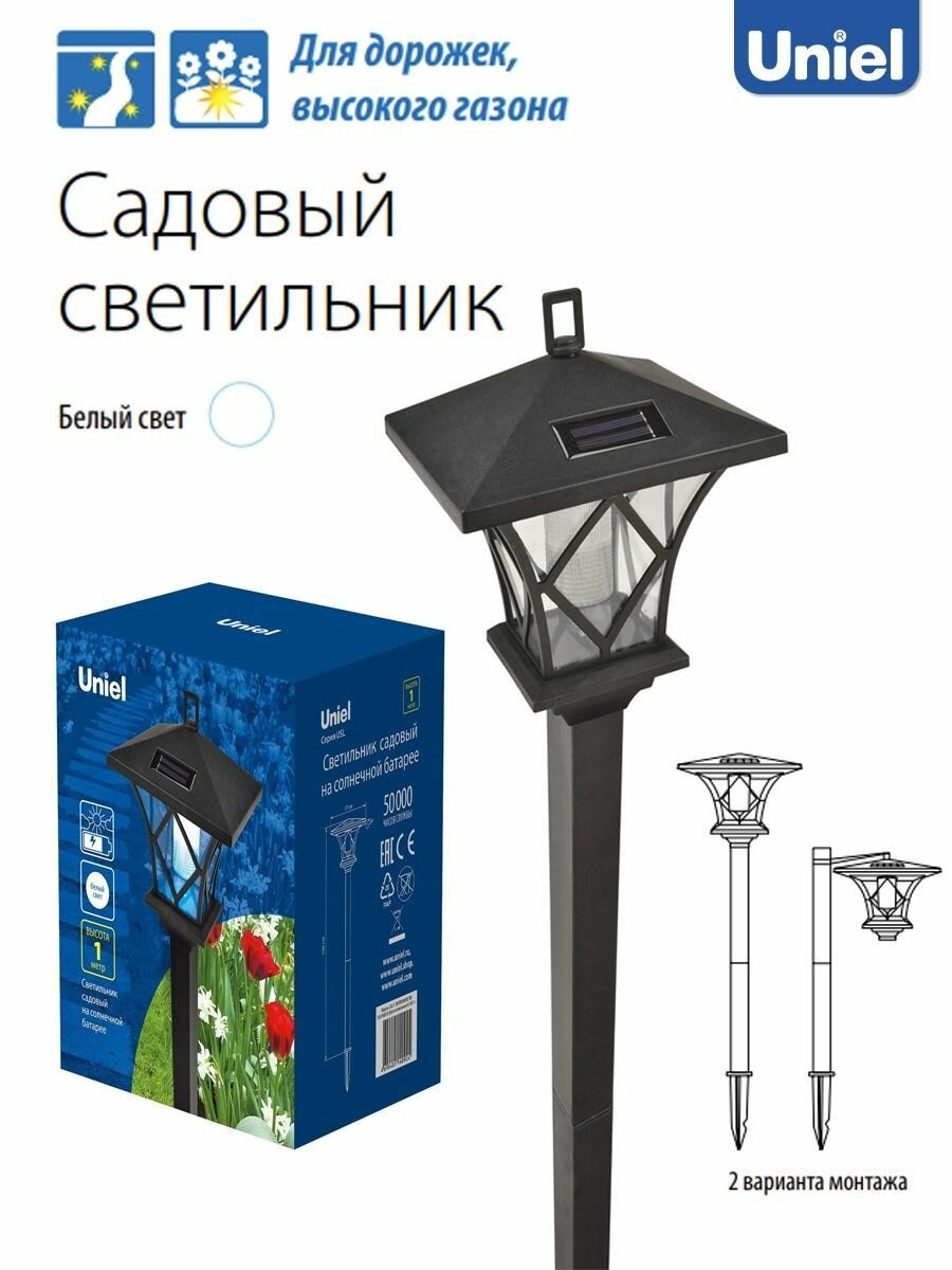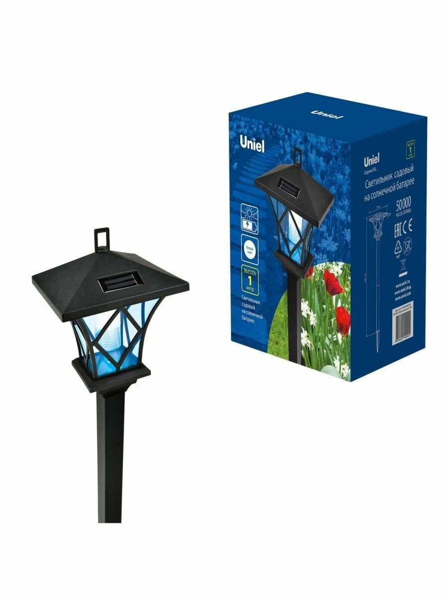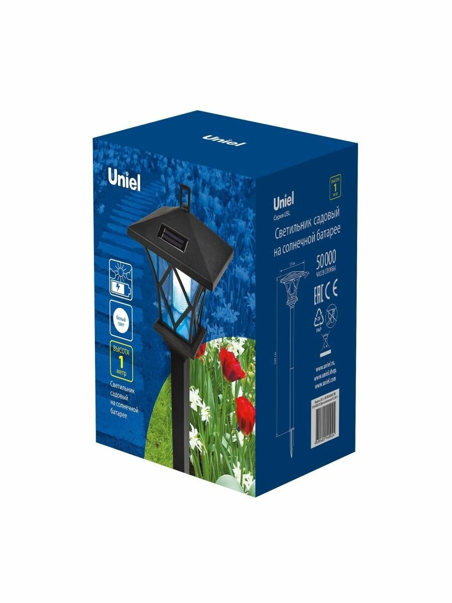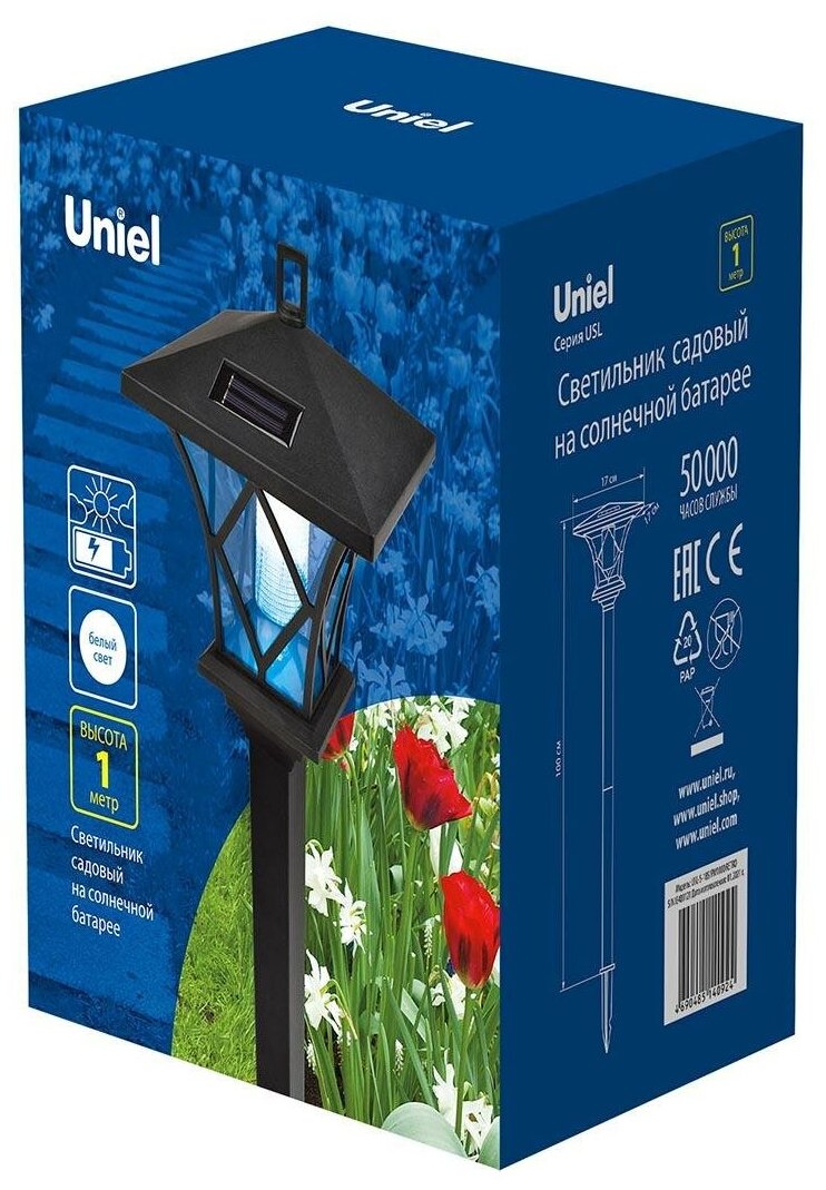 **Столб уличный Uniel «Ретро»** предназначен для освещения территории около дома, сада, стоянки, зоны отдыха. Работает на солнечных батареях, оборудован датчиками движения и освещенности. Источник света — встроенные светодиоды мощностью 0,06 Вт. Корпус изготовлен из пластика. Светильник защищен от дождевой воды (степень защиты IP44). Размер светильника — 17 × 100 × 17 см, цвет черный.