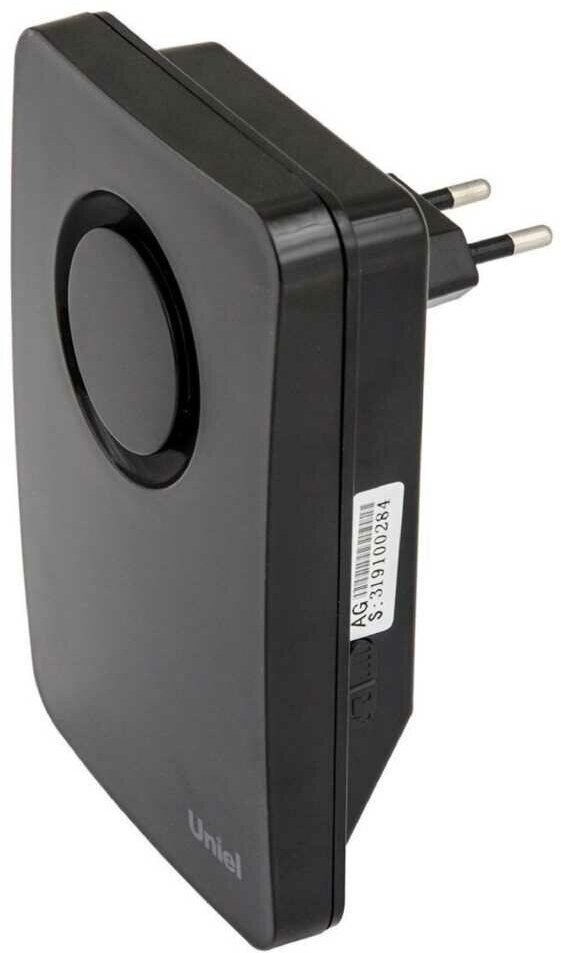 Звонок дверной беспроводной UNIEL (UL-00006437) с радиусом действия 100 м. Звонок настроен на различные частоты, чтобы исключить взаимное влияние двух одинаковых беспроводных комплектов друг на друга. Звонок работает от сети 220В; кнопка работает от одного элемента питания типа 23А-12V (в комплекте батарейка для кнопки).