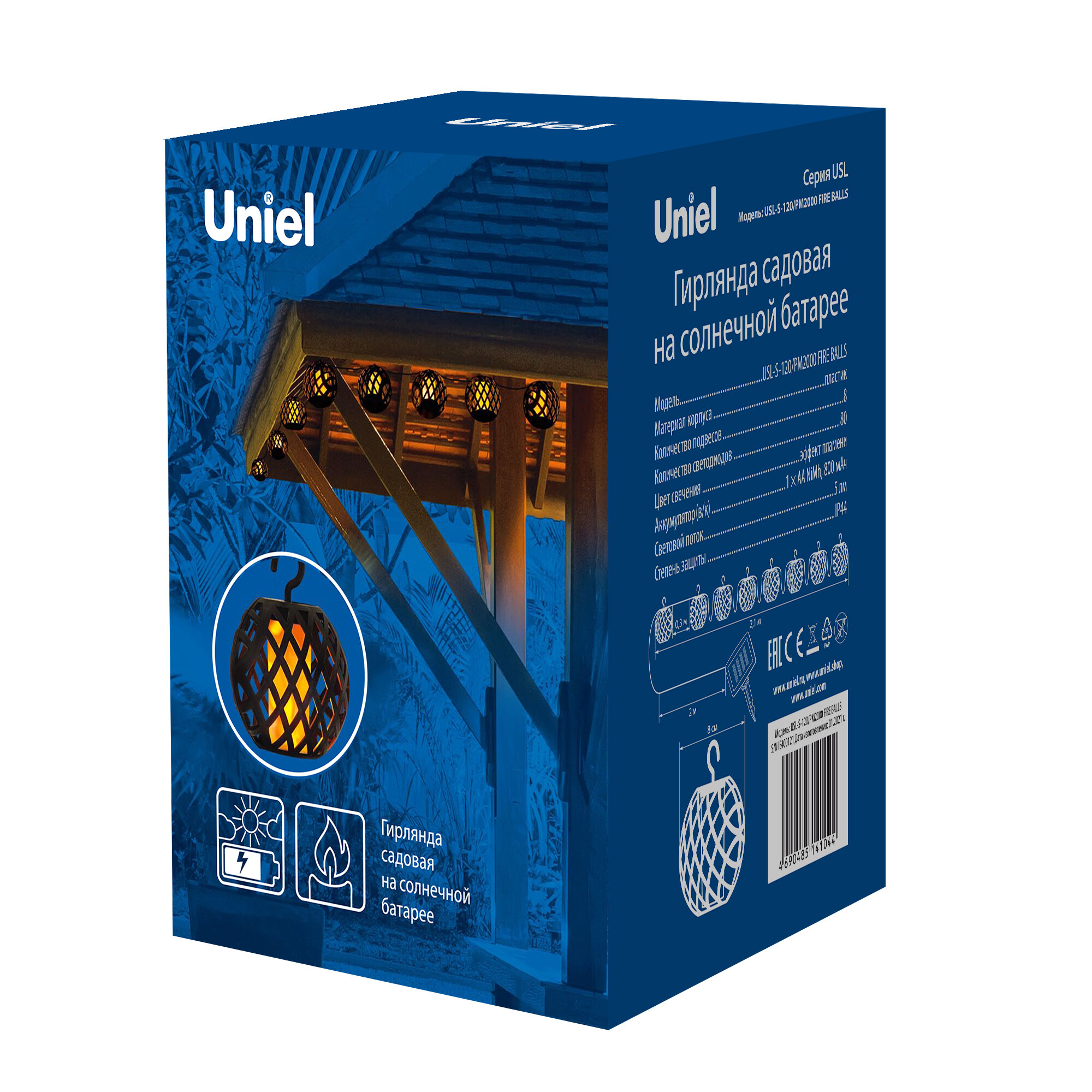 **Uniel «Огненные Шары»** надежно защищен от дождя и низкой температуры, устойчив к УФ-излучению, поэтому может применяться на улице. Служит дополнительным источником освещения и украшением придомовой территории. Светодиодный светильник работает от солнечной батареи, позволяет экономить электроэнергию, не перегревается. Мощность устройства составляет 5,6 Вт.