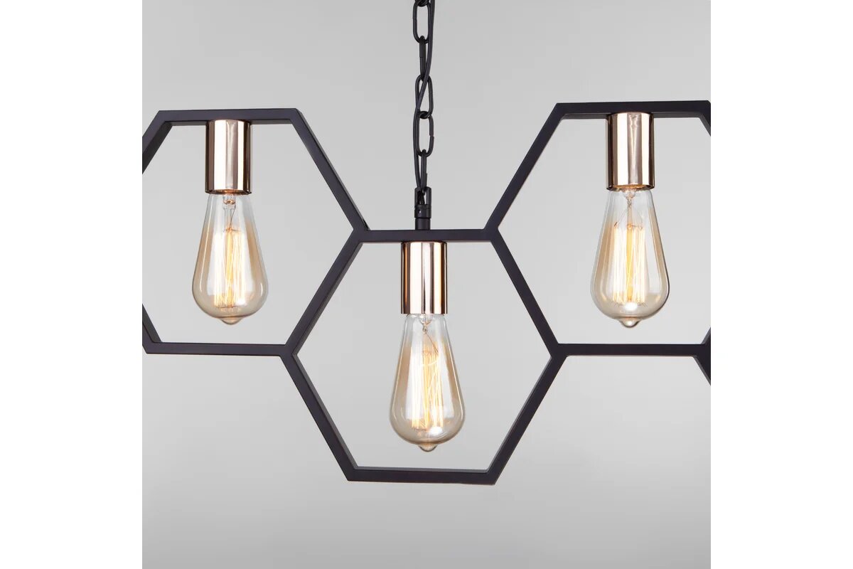 Прибор выполнен в современном стиле. Металлическая арматура окрашена в черный цвет. Плафоны отсутствуют. Привлекают внимание декоративные элементы в виде металлических колец. Они расположены между основанием и стеклянным плафоном. Изделие оснащено пятью лампами с цоколем Е27. Мощность каждой составляет 60 Вт. Предусмотрена возможность регулировки высоты. Максимальная длина подвеса достигает 91,4 см. Другие технические параметры: