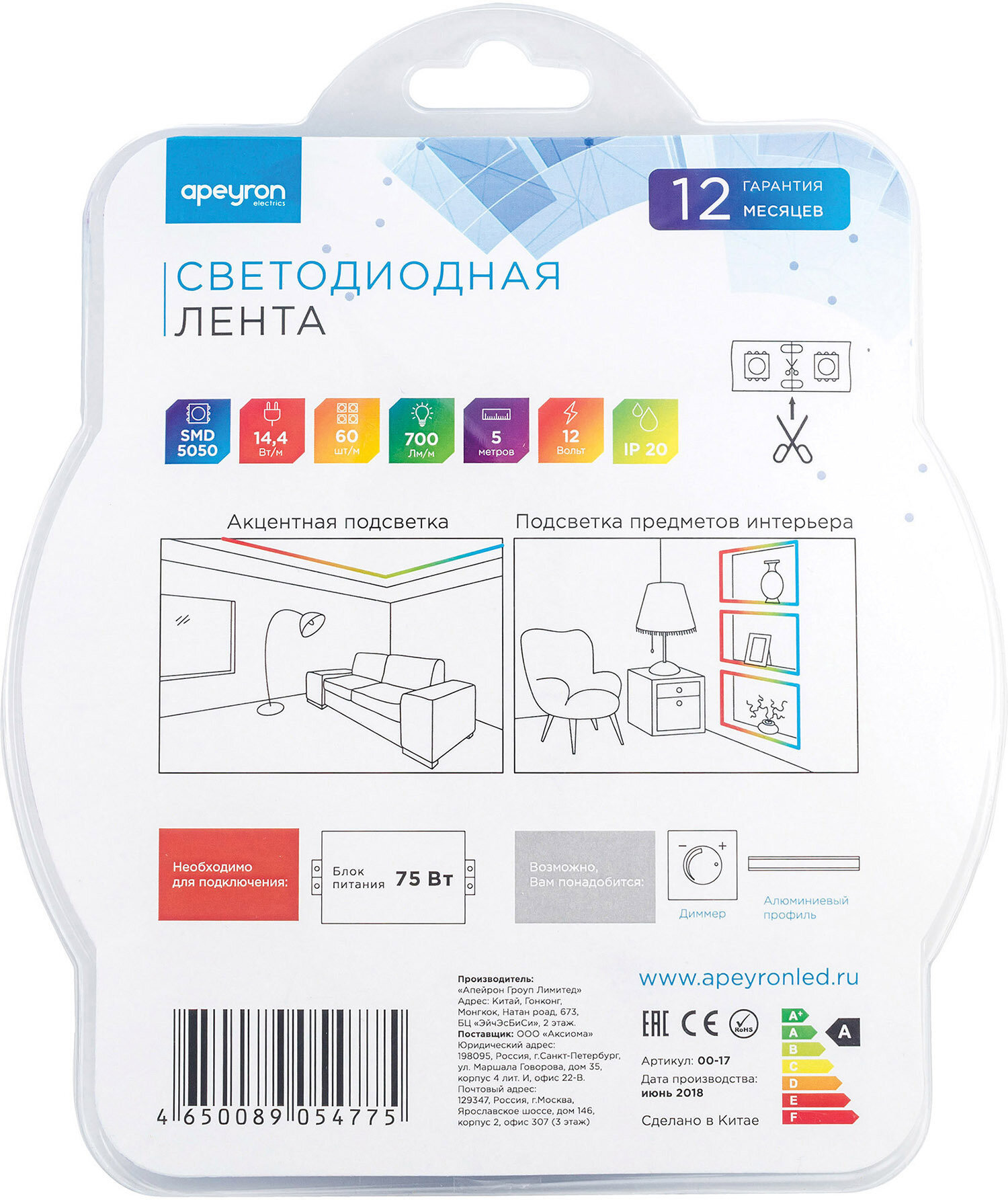 Светодиодная лента Apeyron 144W/m 60LED/m 5050SMD разноцветная 5M 17BL