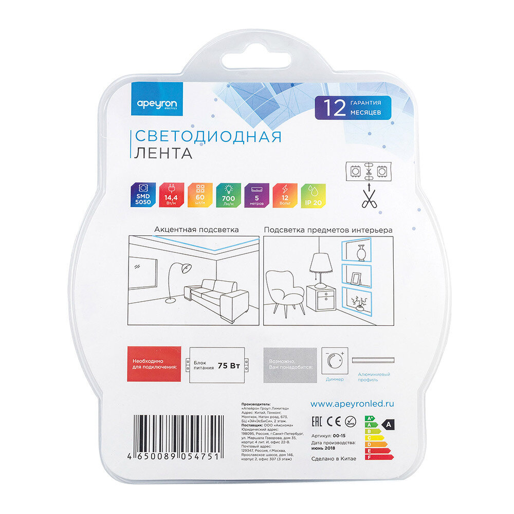 На сегодняшний день товар «Светодиодная лента Apeyron 144W/m 60LED/m 5050SMD холодный белый 5M 15BL» можно купить с кешбеком в 1 магазине: Яндекс.Маркет