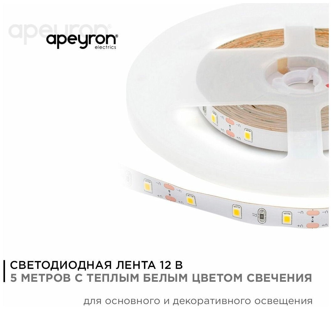 На сегодняшний день товар «Светодиодная лента Apeyron 48W/m 60LED/m 3528SMD теплый белый 5M 03BL» можно купить с кешбеком в 1 магазине: Яндекс.Маркет