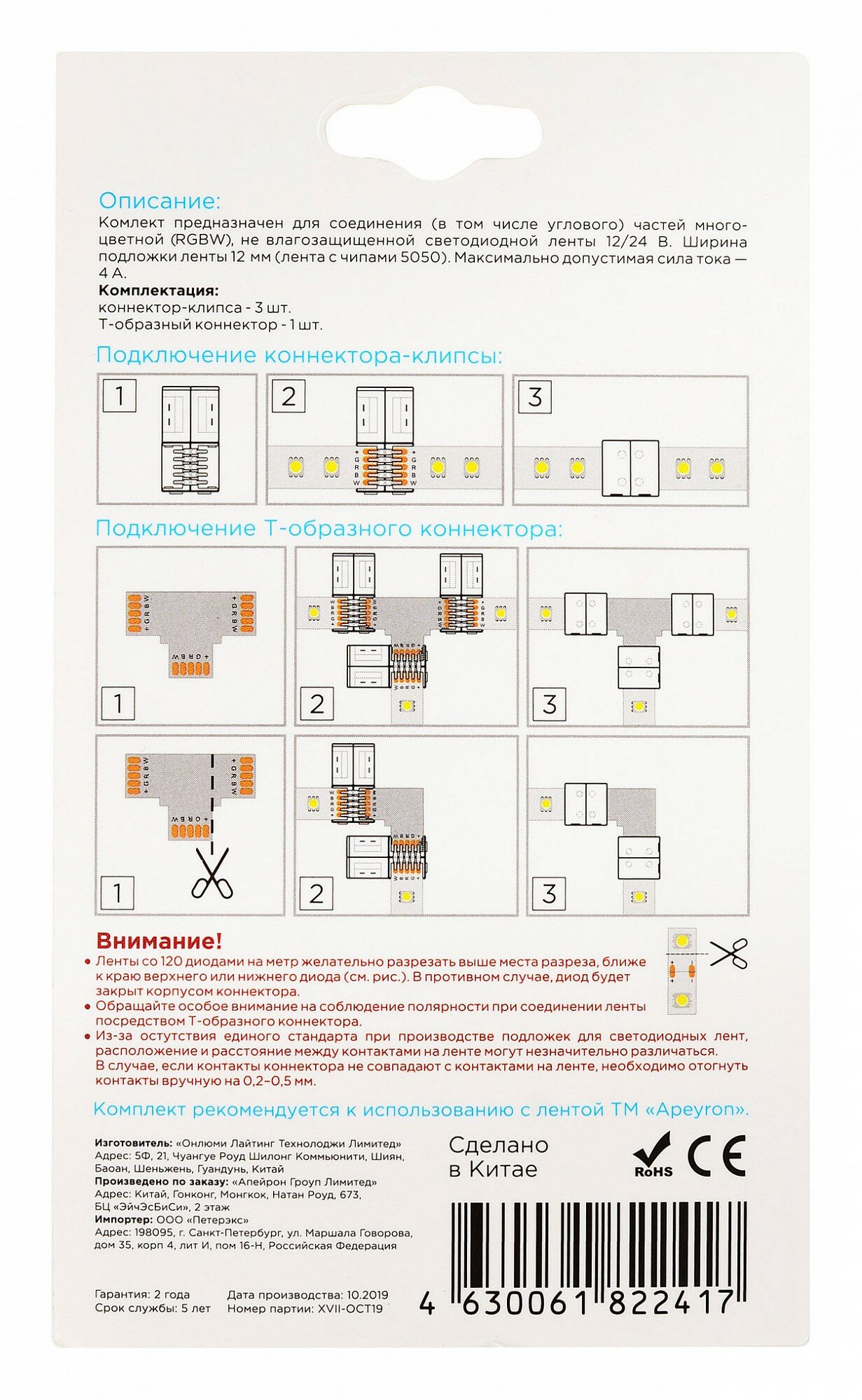 Набор коннекторов для светодиодной ленты RGBW с шириной подложки 10 мм служит прекрасной альтернативой в тех случаях, когда нет возможности паять. Чаще всего подложку шириной 10 мм можно встретить у ленты RGBW со светодиодами 5050, 5060. С помощью коннектора можно сделать Г-образное или Т-образное соединение. В комплект коннекторов входит одна Т-образная плата и 3 зажима для соединения светодиодной ленты. Преимущества: - Подключение светодиодной ленты без пайки; - Может использоваться со светодиодной лентой 12/24 В; - Не требует технически сложного инструмента; - Интуитивно понятное соединение.