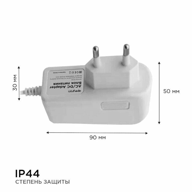 Адаптер сетевой Apeyron 24В 12Вт IP44 0.5A преобразует переменный ток из сети с напряжением 220В в постоянный ток с напряжением 24В и обеспечивает оптимальный режим работы светодиодных осветительных приборов. Блок питания (адаптер) линейки Стандарт отлично подходит для тех случаев, когда нужно наиболее простое решение для организации подсветки. Пластиковый корпус с размерами 90х50х30 мм является отличным решением при отсутствии специального места для изделия, и когда необходимо подключить блок к розетке. Адаптер укомплектован вилкой и коннектором стандарта 5,5х2,5мм "папа" для подключения источника свечения. Шнур с вилкой и выключателем на проводе в комплекте. Для безопасной работы блок дополнительно оснащен схемами защиты светодиодной ленты от аварийных ситуаций: скачков напряжения, возможных коротких замыканий. Входной фильтр обеспечивает бесперебойную работу при скачках напряжения, выходной фильтр сглаживает пульсацию. Данный блок питания имеет степень защиты от пыли и влаги позволяющую его устанавливать на улице и во влажных помещениях, но вдали от источника влаги и в таком месте, где исключено прямое попадание воды.