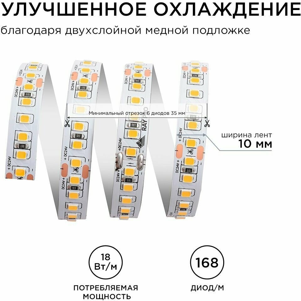 Светодиодная лента из линейки PRO с артикулом работает от постоянного тока с напряжением 24В. Благодаря светодиодам smd2835 излучающим световой поток равный 2000 Лм/м лента является отличным решением для изготовления светодиодных светильников в алюминиевом профиле. Благодаря высокой яркости с помощью таких светильников можно организовать основное освещение не только в жилых помещения, медицинских и образовательных учреждениях, но и торговых залах с большой высотой потолков. По сравнению с лампами накаливания светодиодная лента эквивалентна лампам мощностью 200 Вт. Данная модель светодиодной ленты обладает дневным белым цветом свечения с цветовой температурой 4000 К. При выборе светодиодной ленты важно учитывать такой параметр, как потребляемая мощность, чтобы правильно подобрать блок питания. У данной модели этот показатель равен 18 Вт на один метр. Степень защиты этого изделия соответствует стандарту IP20, что подразумевает использование только в сухих и проветриваемых помещениях. Отрезать светодиодную ленту можно в специально отмеченных местах, которые располагаются через каждые 35 мм. Компактные размеры светодиодной ленты с шириной 10 мм и основанием из гибкой, двухслойной, медной подложки дают огромное преимущество при создании любых дизайнерских фантазий. Преимущества: - Высококачественные светодиоды San’an; - Улучшенное охлаждение благодаря улучшенной двухслойной медной подложке; - Срок службы не менее 50 000 часов; - Коннекторы и провода для подключения уже напаяны на светодиодную ленту; - Простота монтажа благодаря качественному 3М скотчу; - Повышенная экономия электроэнергии по сравнению с традицонными источниками свечения; - Комфортная цветопередача благодаря CRI>90.