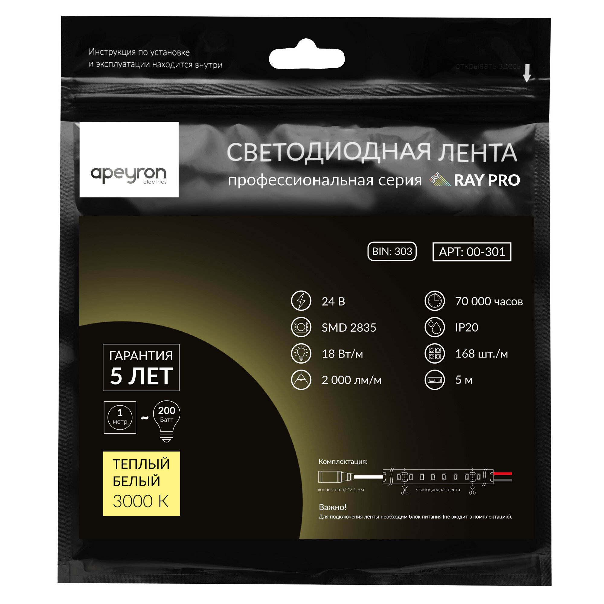 Светодиодная лента Apeyron 18W/m 168Led/m 2835SMD теплый белый 5M 301BL