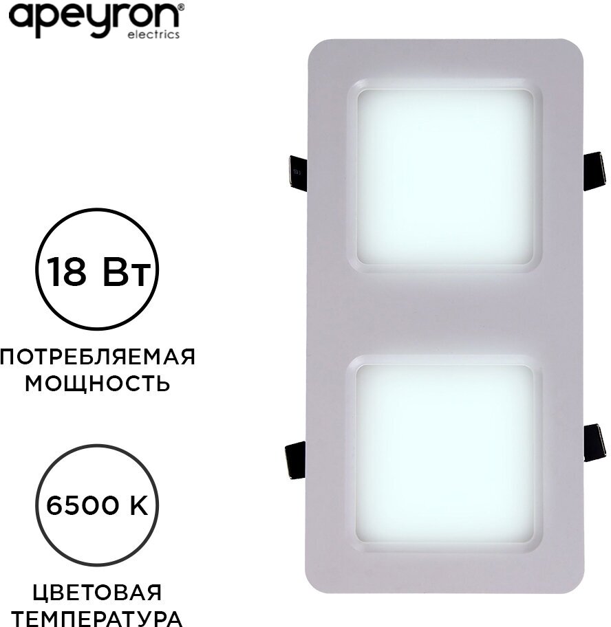 **Светильник точечный светодиодный встраиваемый Apeyron** мощностью 18 Вт излучает холодный белый свет. Температура цвета составляет 6500 К. Корпус белого цвета сделан из пластика, защищен от попадания пыли и влаги в соответствии с классом IP20. Работает от сети переменного тока. Для управления используют настенный выключатель.