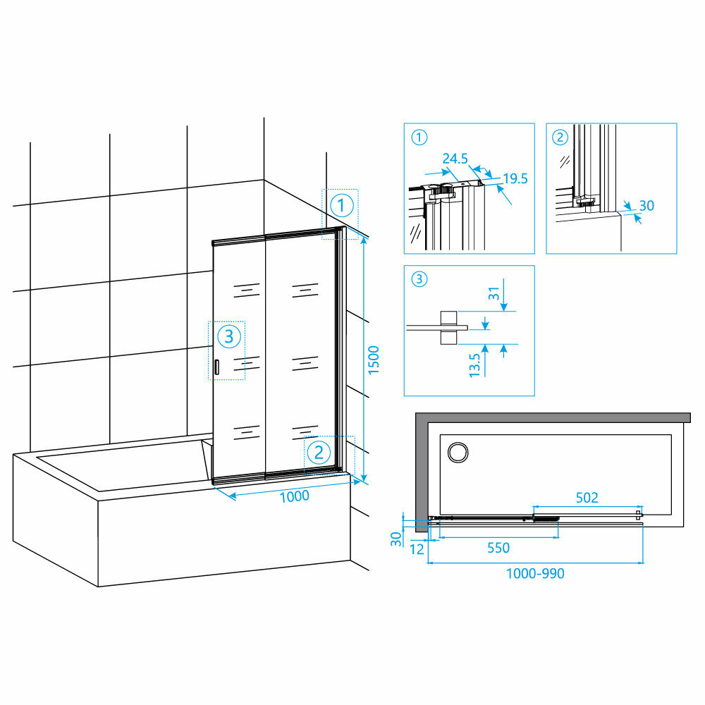 Стеклянная шторка на ванну RGW Screens SC-40 100x150 раздвижная. Три полотна: два сдвижных и одно неподвижное.