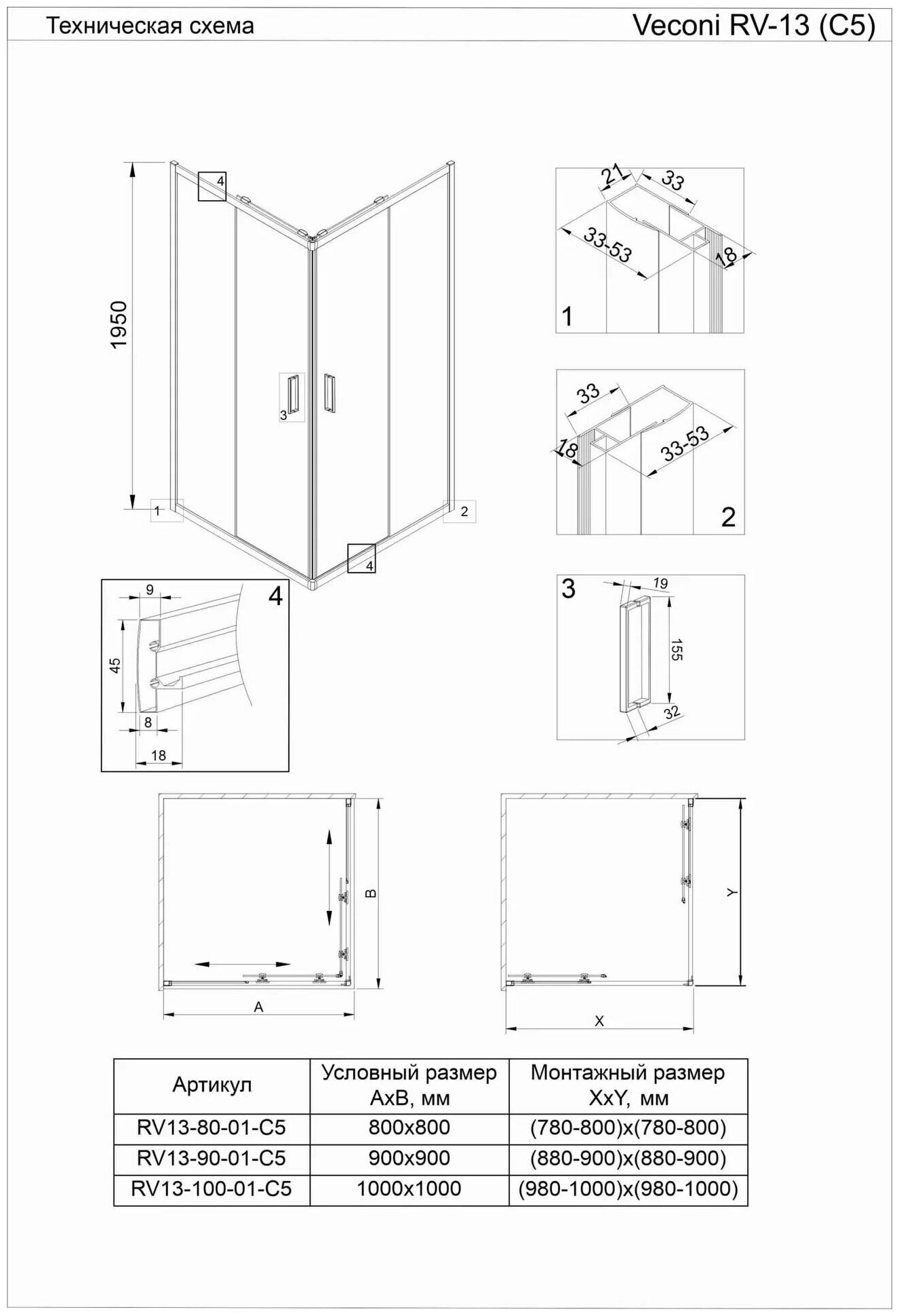 Душевой уголок Veconi Rovigo RV-13 80x80 с двумя раздвижными дверьми и универсальной ориентацией.