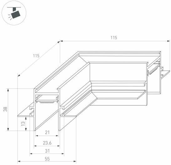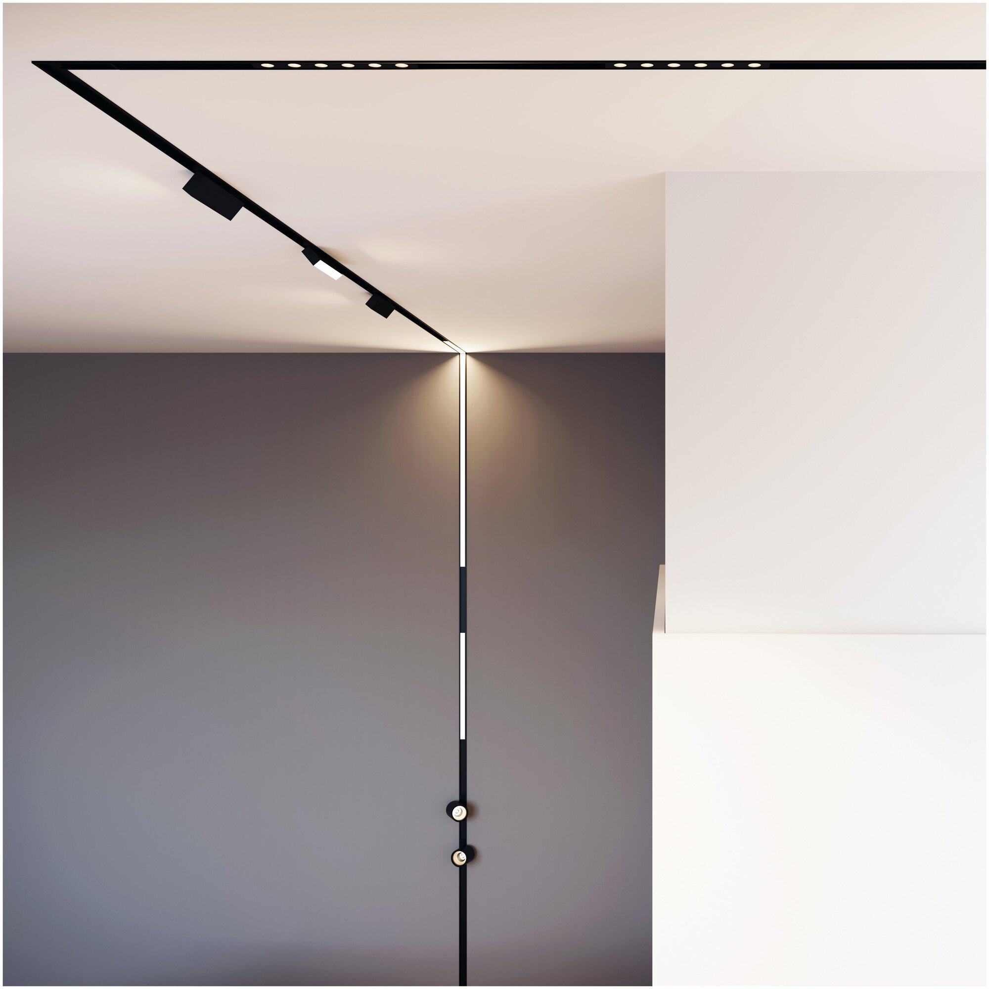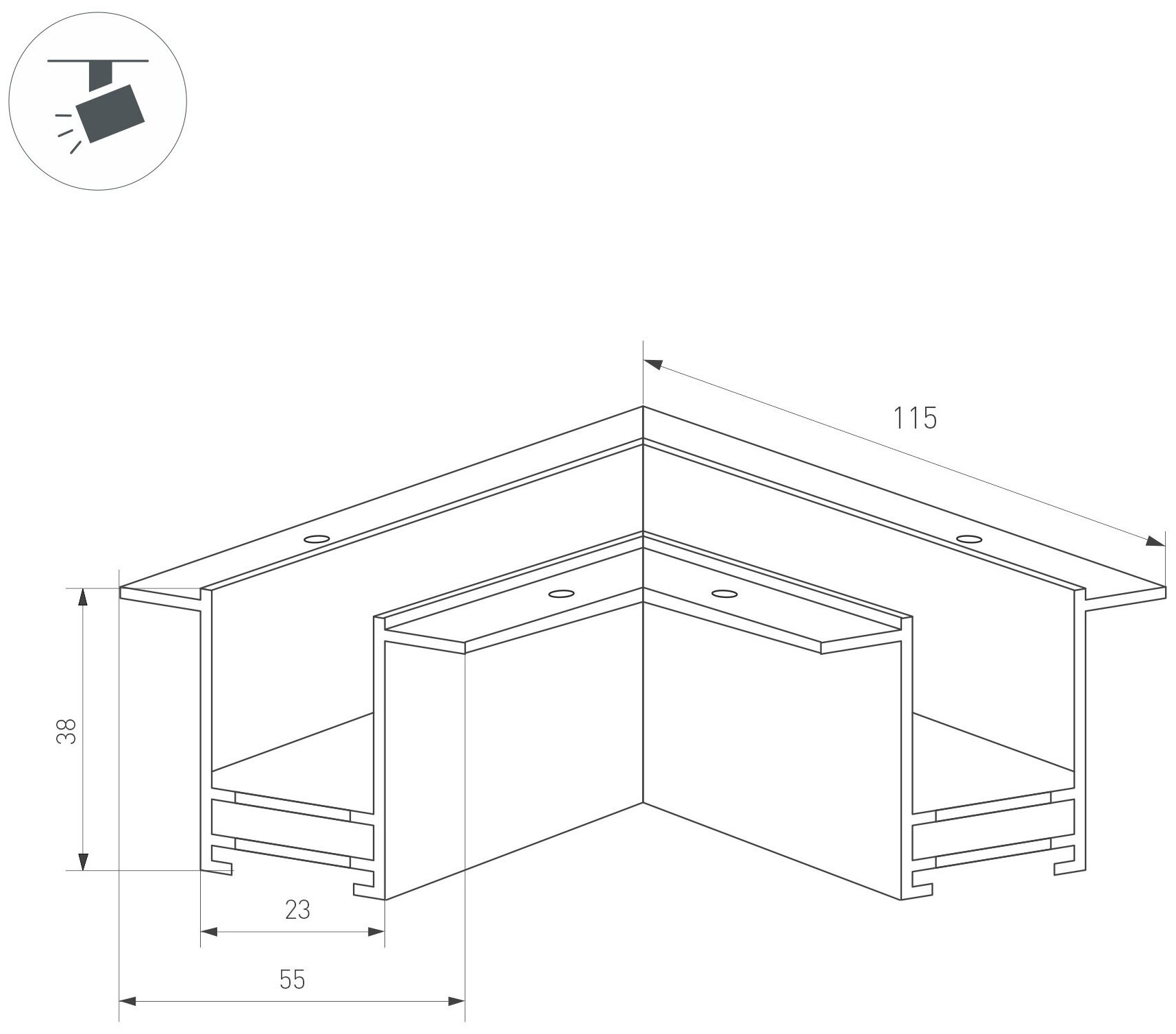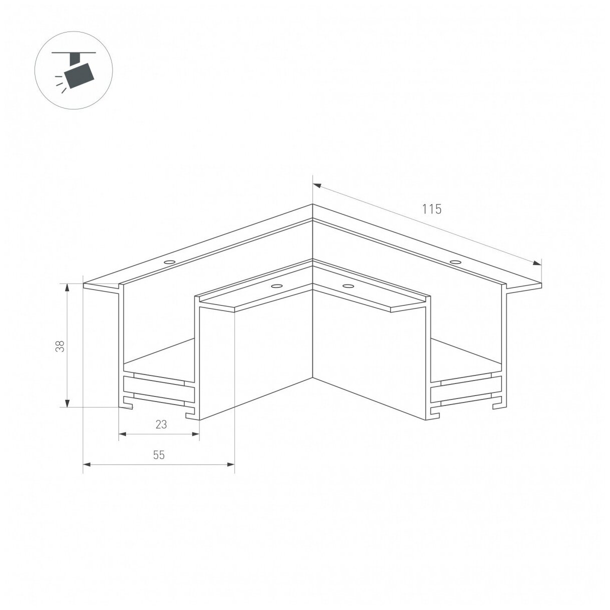 Угловой прямой коннектор для встраиваемого трека MAG-TRACK-2538-FDW. DC24V. Материал алюминий, цвет черный. Размеры 115x115x55x38мм.