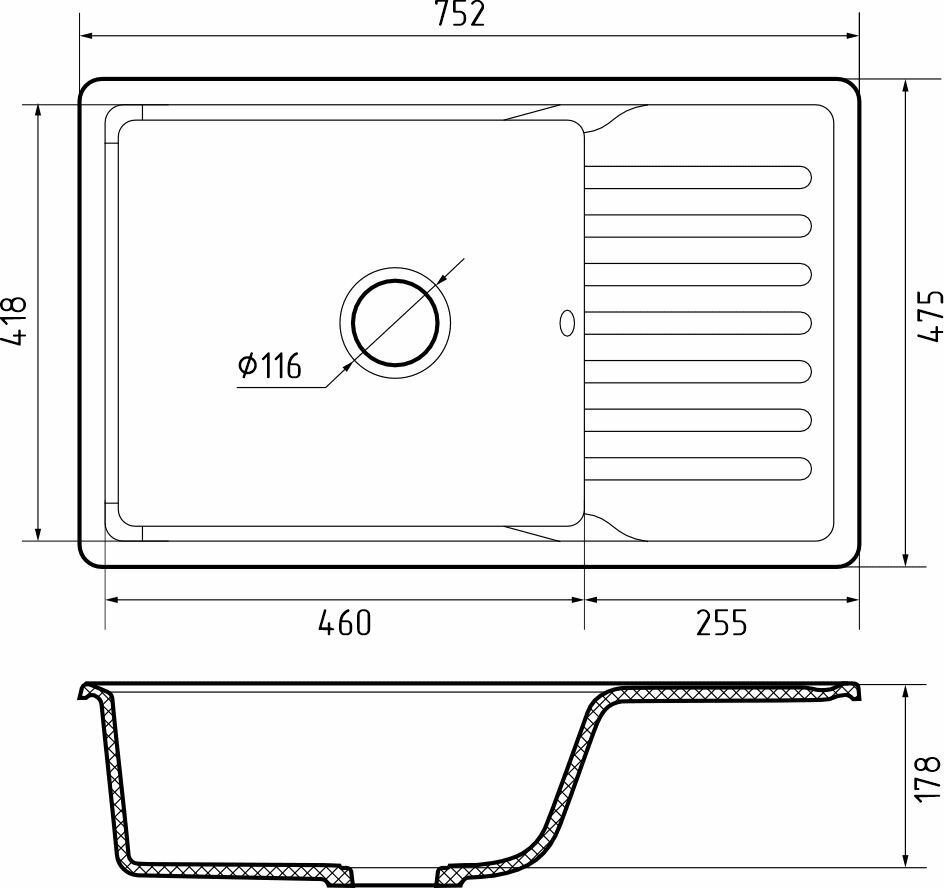 Общий размер: 752*475 мм. Размер чаши: 460х418х178 мм. Тип монтажа: классический врезной. Установочный проем: 732*455 мм. Материал: кварцевый композит. Производство: Россия. Гарантия: 1 год