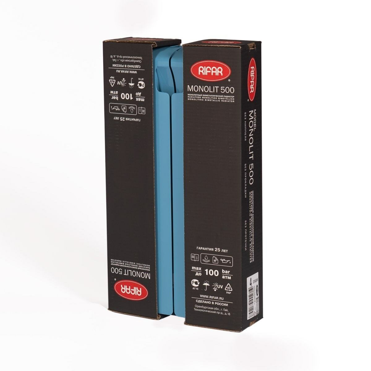 Биметаллический радиатор MONOLIT – это принципиально новый, запатентованный отопительный прибор компании «рифар» с особо высокими техническими характеристиками, отвечающими самым суровым условиям эксплуатации. Внешне похожий на обычные биметаллические и алюминиевые секционные радиаторы, радиатор MONOLIT отличается от них тем, что внутри него теплоноситель движется по стальным каналам, соединенным с помощью уникальной технологии сварки в единую неразборную конструкцию. Благодаря этому в радиаторе MONOLIT в принципе отсутствуют участки, потенциально опасные для возникновения протечек. Радиаторы MONOLIT обладают исключительной надежностью, а также высокой теплоотдачей, которая достигается за счет развитой геометрии теплопередающих поверхностей из алюминиевого сплава. Конструкция и технология изготовления биметаллического радиатора отопления MONOLIT обеспечивают: Долговечность эксплуатации. Гарантия производителя – 25 лет. Эффективность поддержания комфортного температурного режима. Высокую стойкость к коррозии. Каналы, по которым проходит теплоноситель, сделаны из стали повышенной коррозионной стойкости, а их толщина соответствует толщине обычных стальных водопроводных труб. Отсутствие межсекционных стыков. Индифферентность к типу теплоносителя и качеству его подготовки в системах индивидуального и коллективного отопления. Возможность использования в качестве теплоносителя различных незамерзающих жидкостей. Возможность использования радиатора при высокой (до 135 °С) температуре теплоносителя. Высокую прочность конструкции. Рабочее давление теплоносителя – до 30 атм; испытательное давление – 45 атм. Возможность применения в помещениях различного назначения, в том числе в медицинских учреждениях, в детских дошкольных учреждениях и т. д. – за счет наилучшего соотношения радиационной и конвективной составляющей теплового потока. Легкость монтажа. Нет необходимости установки переходников с левой и правой резьбой. Стандартные резьбовые соединения G1/2” или G3/4” являются неотъемлемой частью конструкции радиатора. Серийно производятся радиаторы с числом секций от 4 до 14. Радиаторы модификации RIFAR MONOLIT Ventil предназначены для нижнего подключения к системе отопления и применяются при устройстве современных систем отопления с лучевой разводкой или модернизации традиционных систем отопления со скрытием инженерных коммуникаций. Подтверждая высокие конструктивные характеристики своих радиаторов и благодаря системе контроля качества, действующей на предприятии, компания рифар устанавливает гарантийный срок на радиаторы модели MONOLIT 25 лет при соблюдении условий монтажа и эксплуатации. Радиаторы RIFAR MONOLIT прошли обязательную сертификацию на соответствие требованиям ГОСТ 31311-2005. Вся продукция застрахована спао «ингосстрах».
