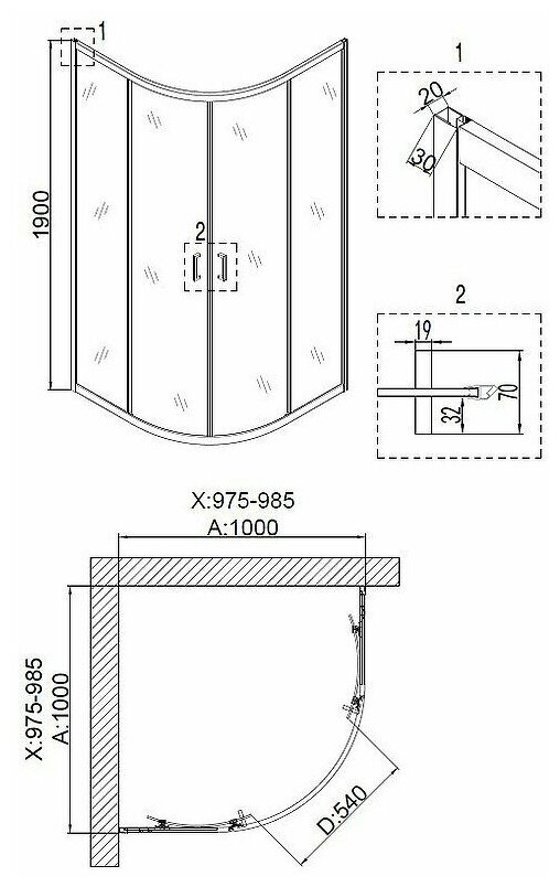 Особенности конструкции данного уголка позволяют осуществлять монтаж как с поддоном, так и без. закаленное стекло - из которого изготовлен уголок обеспечивает высокий уровень надежности и ударостойкости, а раздвижная конструкция дверей обеспечивает максимальную ширину входа 54 см. Материал профиля алюминий, этот металл не подвержен процессу ржавления и не потеряет свой эстетический внешний вид на протяжении всего срока эксплуатации.