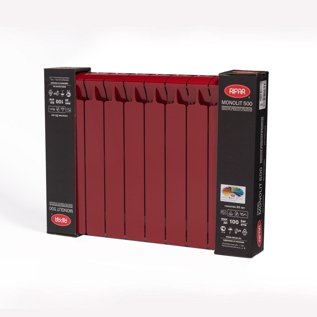 Биметаллический радиатор MONOLIT – это принципиально новый, запатентованный отопительный прибор компании «рифар» с особо высокими техническими характеристиками, отвечающими самым суровым условиям эксплуатации. Внешне похожий на обычные биметаллические и алюминиевые секционные радиаторы, радиатор MONOLIT отличается от них тем, что внутри него теплоноситель движется по стальным каналам, соединенным с помощью уникальной технологии сварки в единую неразборную конструкцию. Благодаря этому в радиаторе MONOLIT в принципе отсутствуют участки, потенциально опасные для возникновения протечек. Радиаторы MONOLIT обладают исключительной надежностью, а также высокой теплоотдачей, которая достигается за счет развитой геометрии теплопередающих поверхностей из алюминиевого сплава. Конструкция и технология изготовления биметаллического радиатора отопления MONOLIT обеспечивают: Долговечность эксплуатации. Гарантия производителя – 25 лет. Эффективность поддержания комфортного температурного режима. Высокую стойкость к коррозии. Каналы, по которым проходит теплоноситель, сделаны из стали повышенной коррозионной стойкости, а их толщина соответствует толщине обычных стальных водопроводных труб. Отсутствие межсекционных стыков. Индифферентность к типу теплоносителя и качеству его подготовки в системах индивидуального и коллективного отопления. Возможность использования в качестве теплоносителя различных незамерзающих жидкостей. Возможность использования радиатора при высокой (до 135 °С) температуре теплоносителя. Высокую прочность конструкции. Рабочее давление теплоносителя – до 30 атм; испытательное давление – 45 атм. Возможность применения в помещениях различного назначения, в том числе в медицинских учреждениях, в детских дошкольных учреждениях и т. д. – за счет наилучшего соотношения радиационной и конвективной составляющей теплового потока. Легкость монтажа. Нет необходимости установки переходников с левой и правой резьбой. Стандартные резьбовые соединения G1/2” или G3/4” являются неотъемлемой частью конструкции радиатора. Серийно производятся радиаторы с числом секций от 4 до 14. Радиаторы модификации RIFAR MONOLIT Ventil предназначены для нижнего подключения к системе отопления и применяются при устройстве современных систем отопления с лучевой разводкой или модернизации традиционных систем отопления со скрытием инженерных коммуникаций. Подтверждая высокие конструктивные характеристики своих радиаторов и благодаря системе контроля качества, действующей на предприятии, компания рифар устанавливает гарантийный срок на радиаторы модели MONOLIT 25 лет при соблюдении условий монтажа и эксплуатации. Радиаторы RIFAR MONOLIT прошли обязательную сертификацию на соответствие требованиям ГОСТ 31311-2005. Вся продукция застрахована спао «ингосстрах».