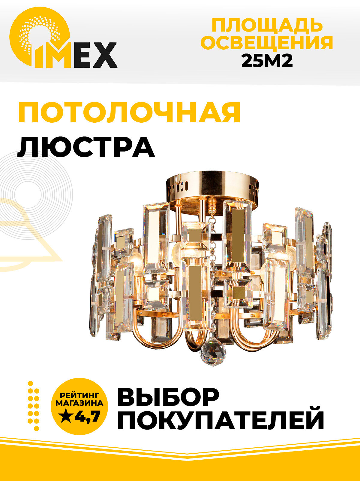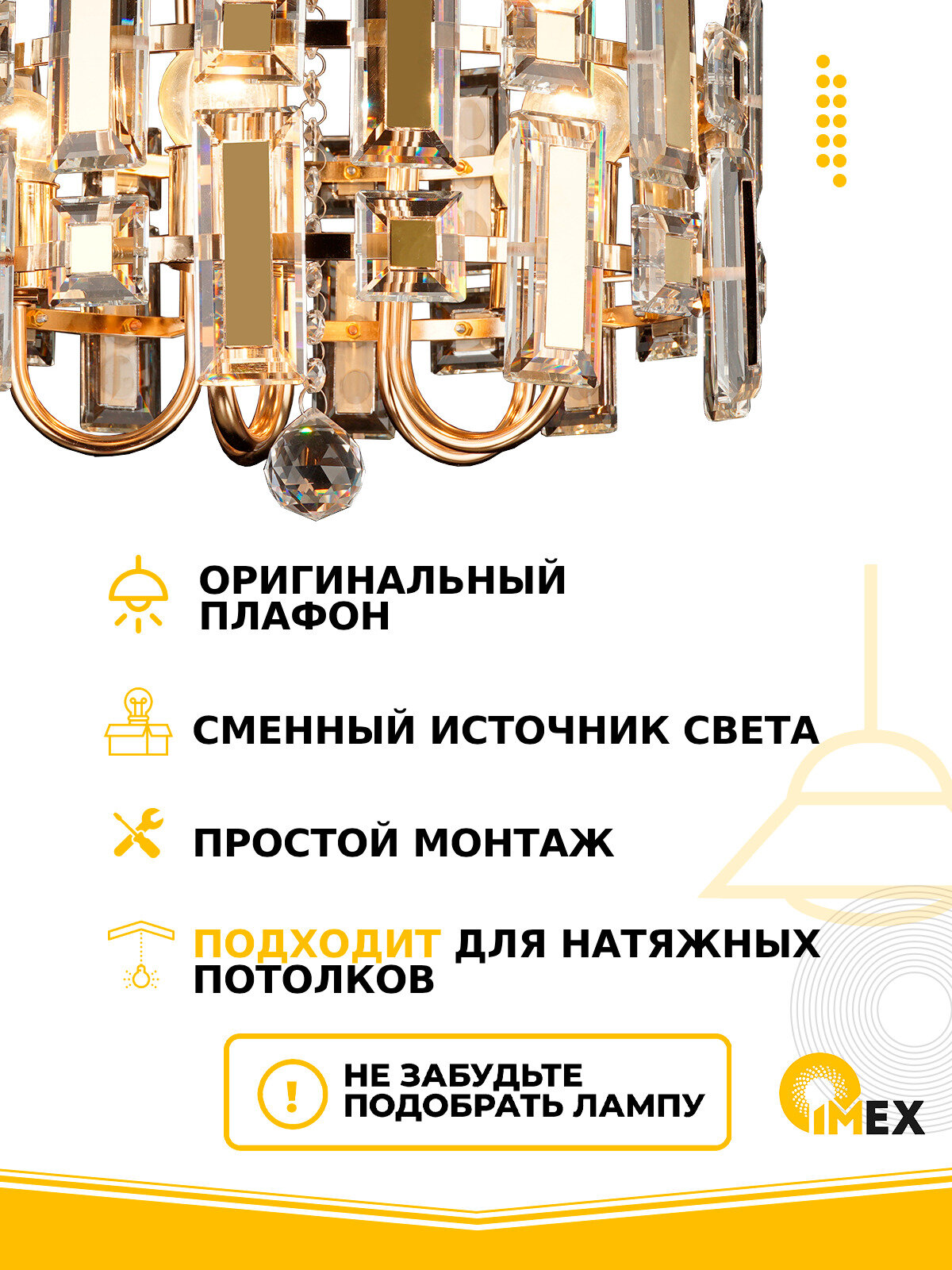 Потолочная люстра - продукт известной компании Imex (Германия). Имеет максимальную мощность 300 Вт, освещает площадь до 15 кв. м. Отлично подойдет для таких мест, как гостиная, спальня. Впишется в интерьеры следующих стилей: модерн.