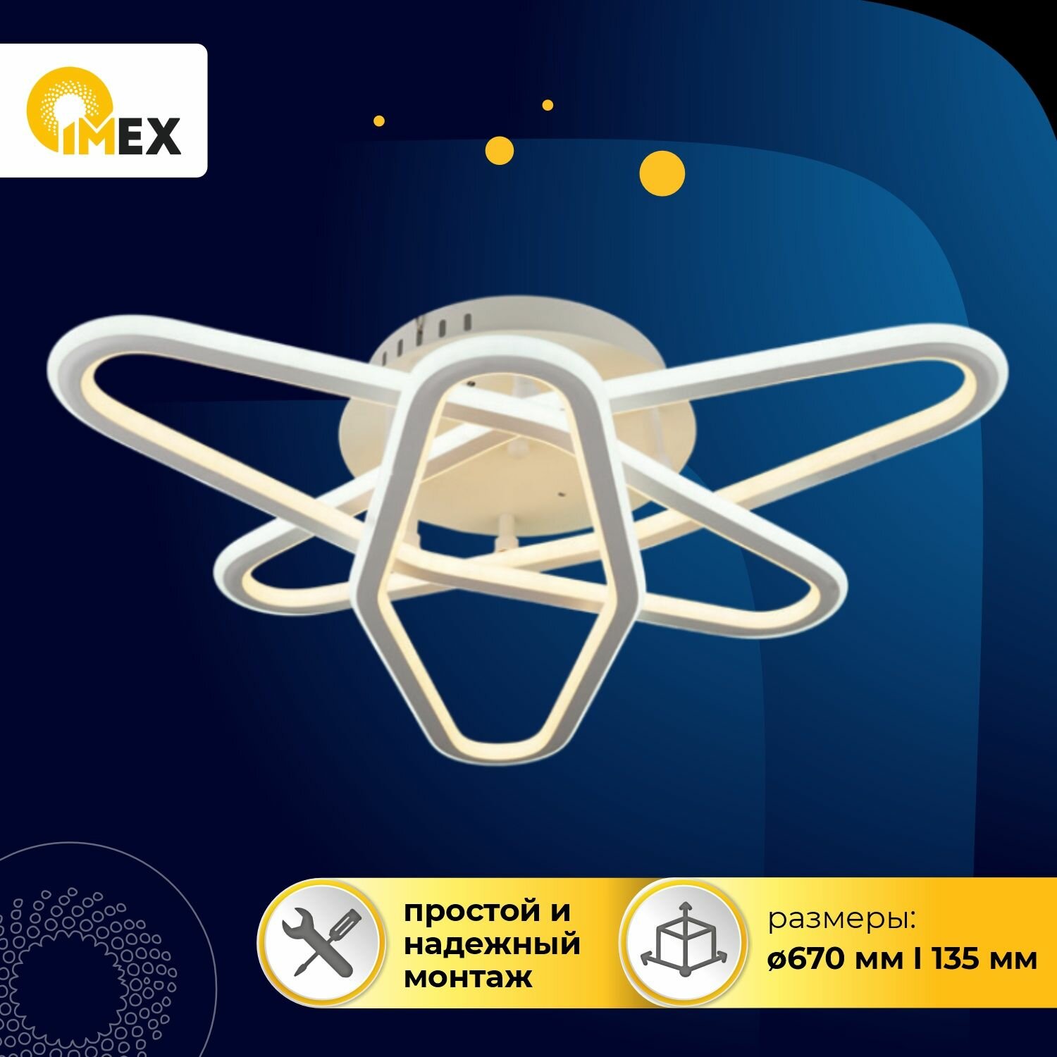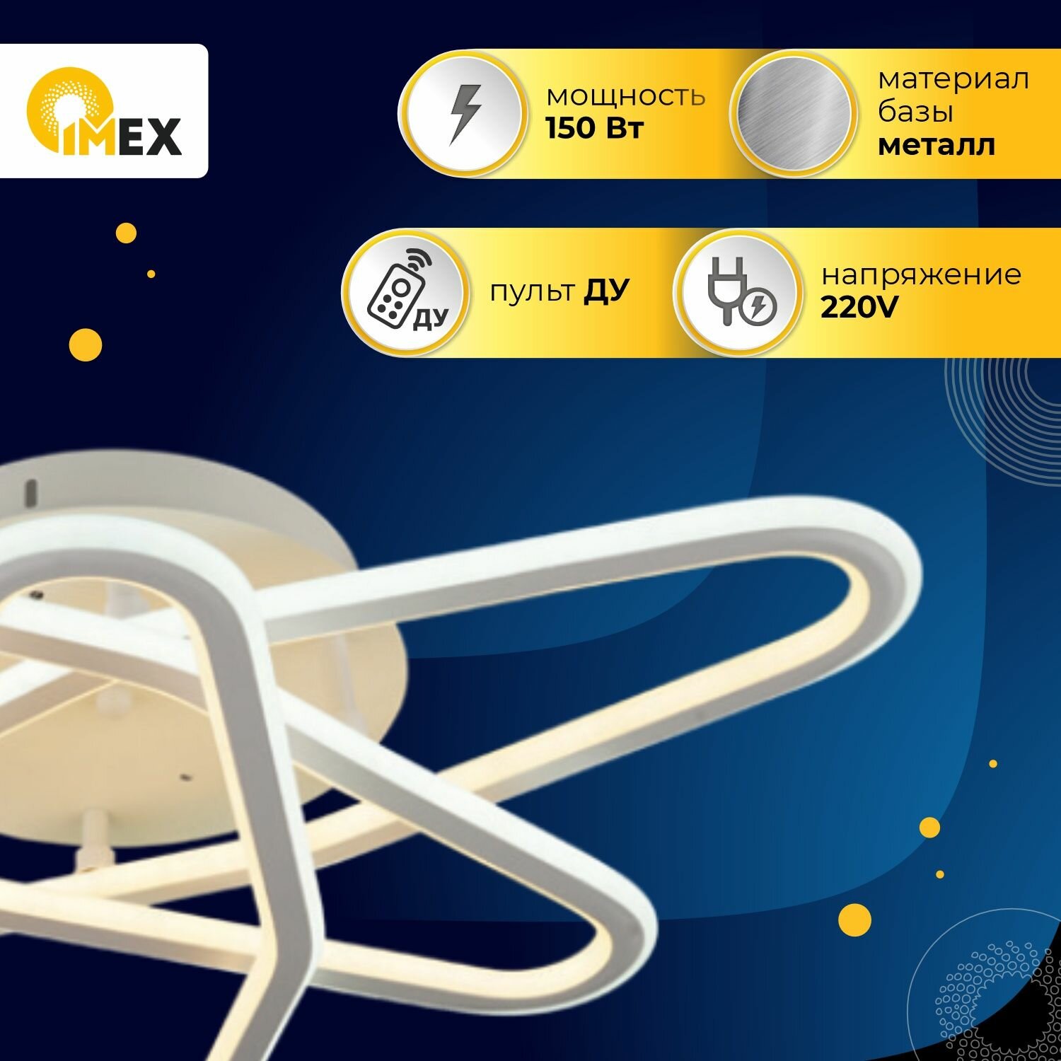 Потолочная люстра светодиодная с пультом - продукт известной компании Imex (Германия). Имеет максимальную мощность 150 Вт, освещает площадь до 30 кв. м. Отлично подойдет для таких мест, как гостиная, спальня. Впишется в интерьеры следующих стилей: современный.