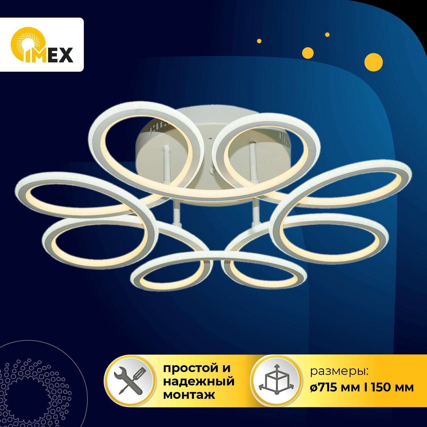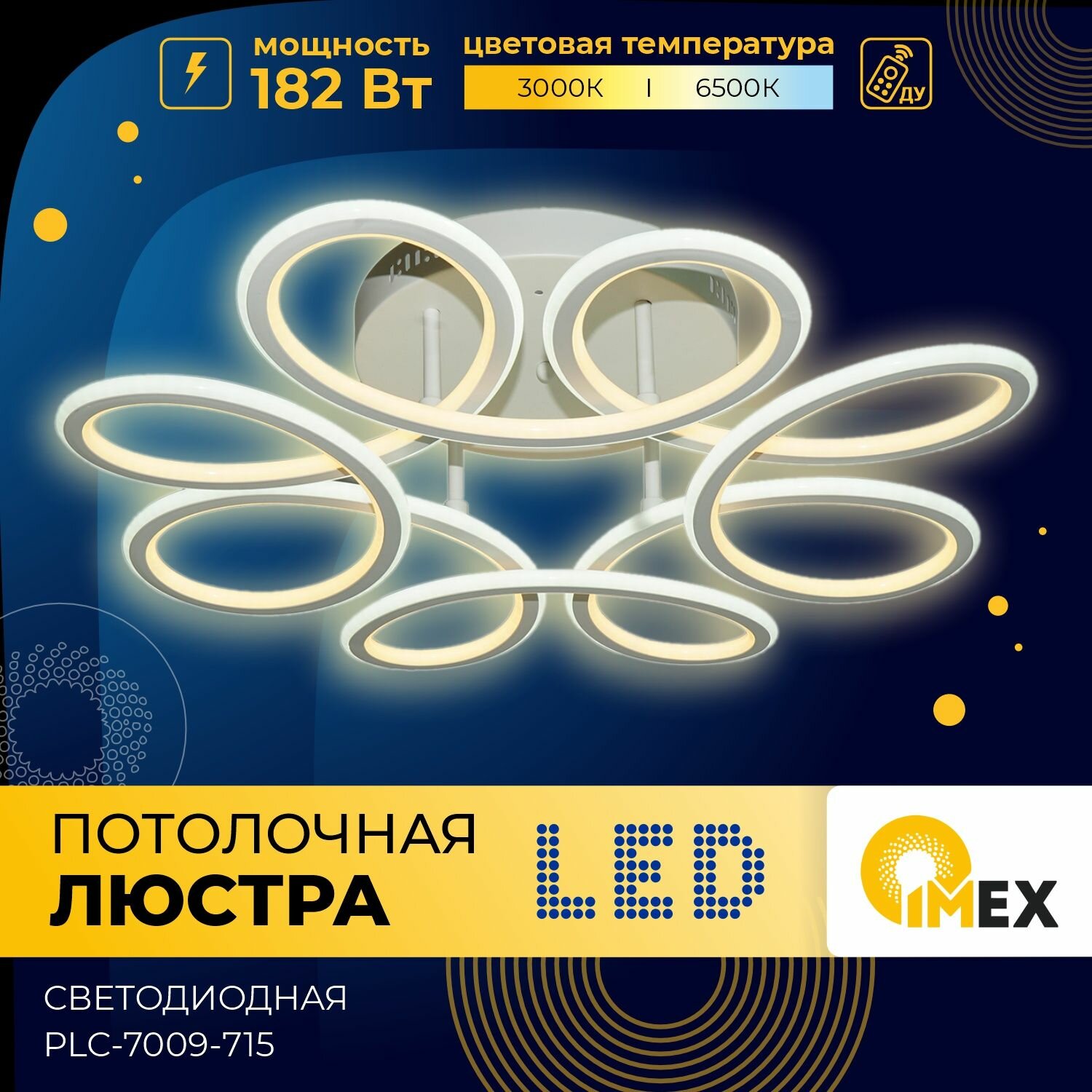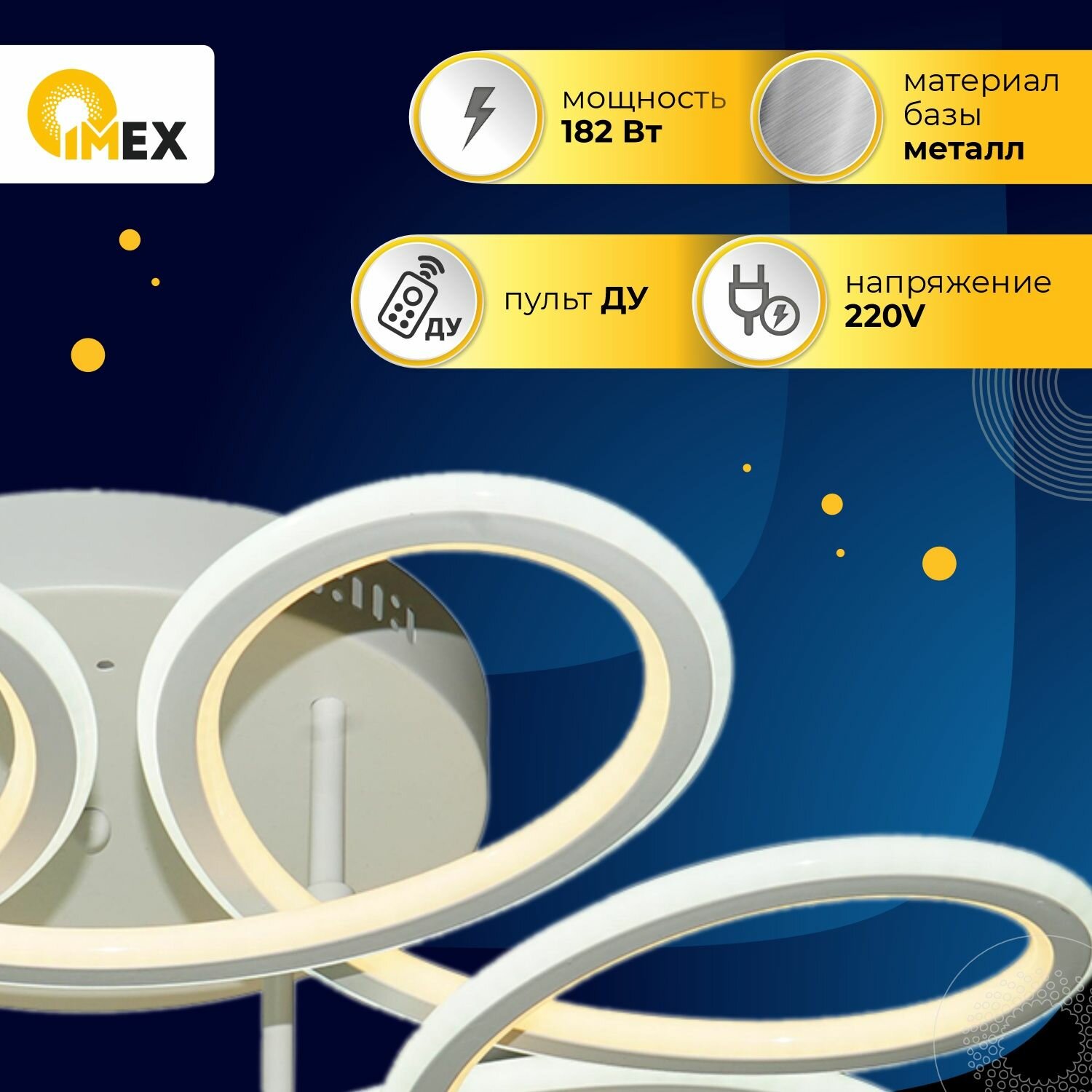 Потолочная светодиодная люстра с пультом - продукт известной компании Imex (Германия). Имеет максимальную мощность 182 Вт, освещает площадь до 36 кв. м. Отлично подойдет для таких мест, как гостиная, спальня, кухня. Впишется в интерьеры следующих стилей: современный, хай-тек.