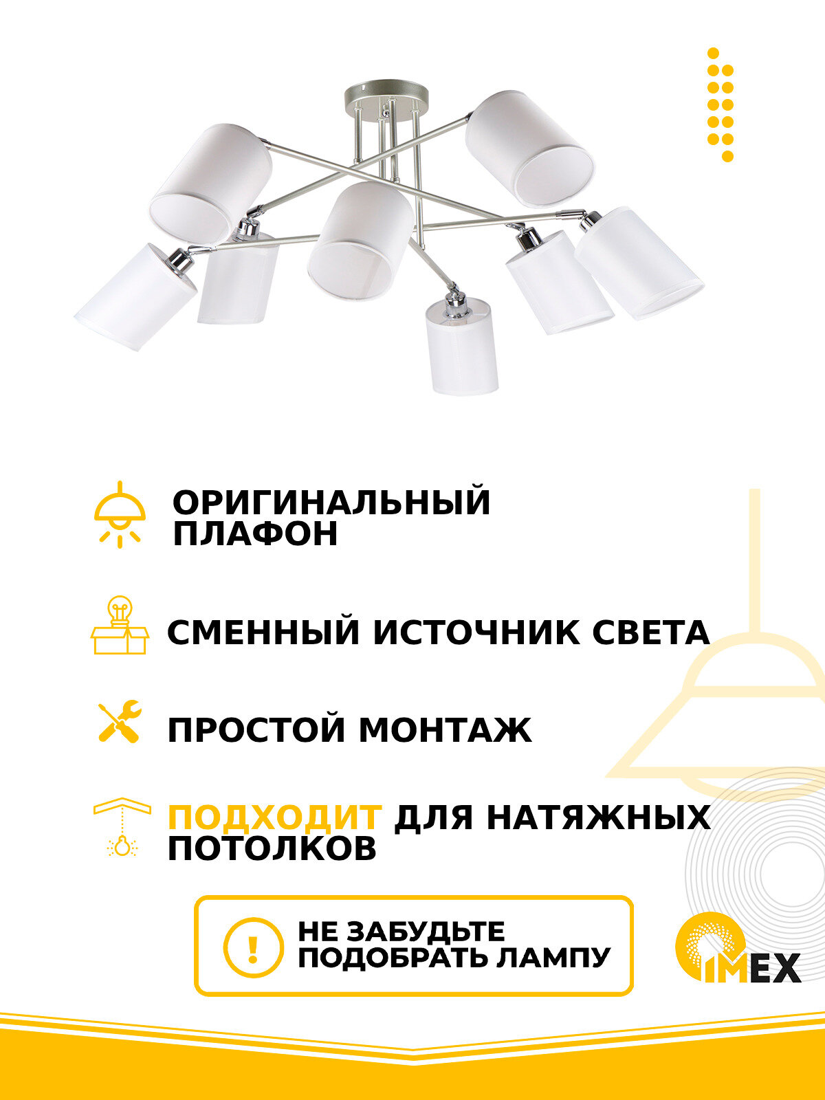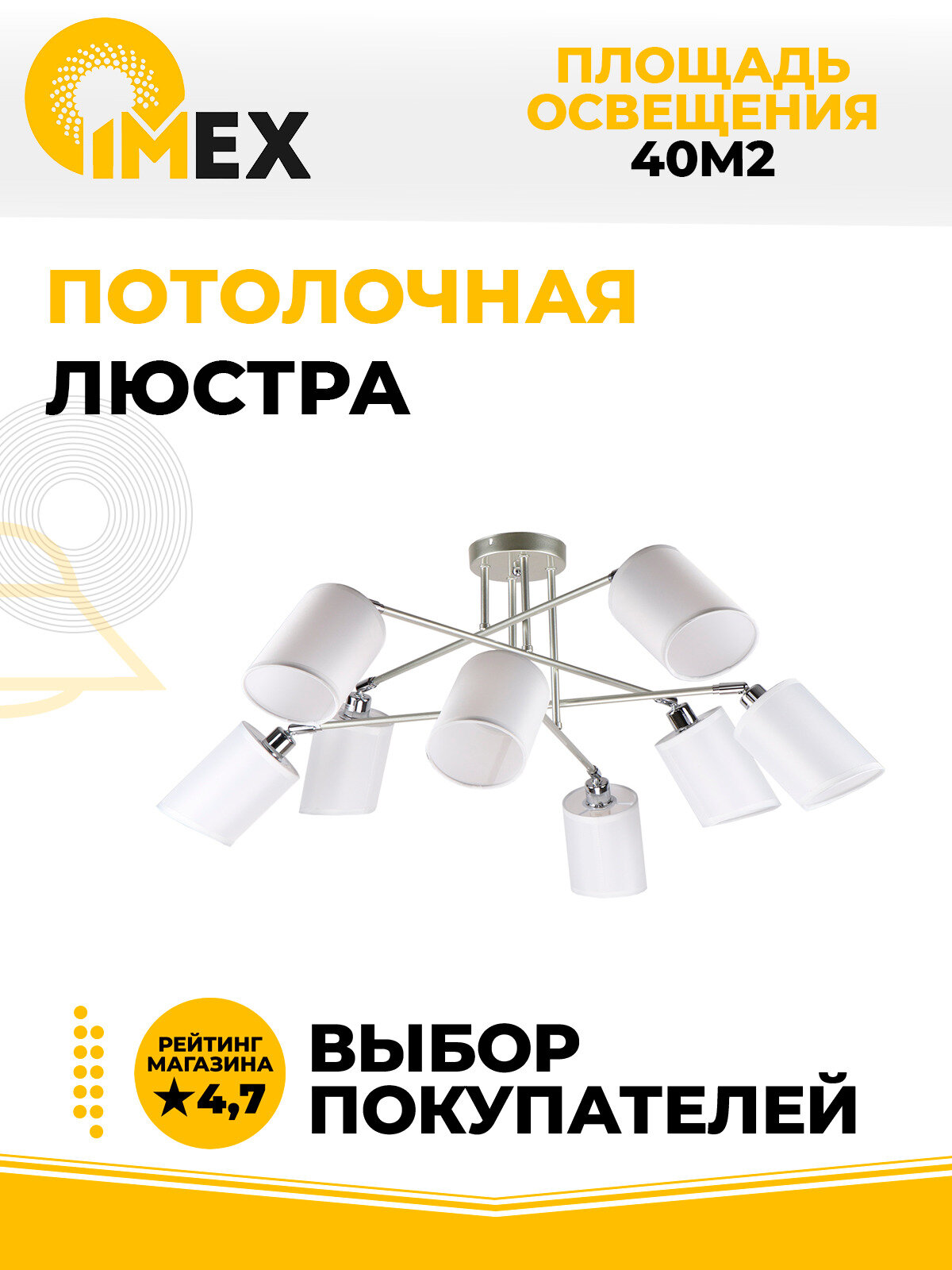 Потолочная люстра - продукт известной компании Imex (Германия). Имеет максимальную мощность 480 Вт, освещает площадь до 24 кв. м. Отлично подойдет для таких мест, как гостиная, спальня, кухня. Впишется в интерьеры следующих стилей: модерн.