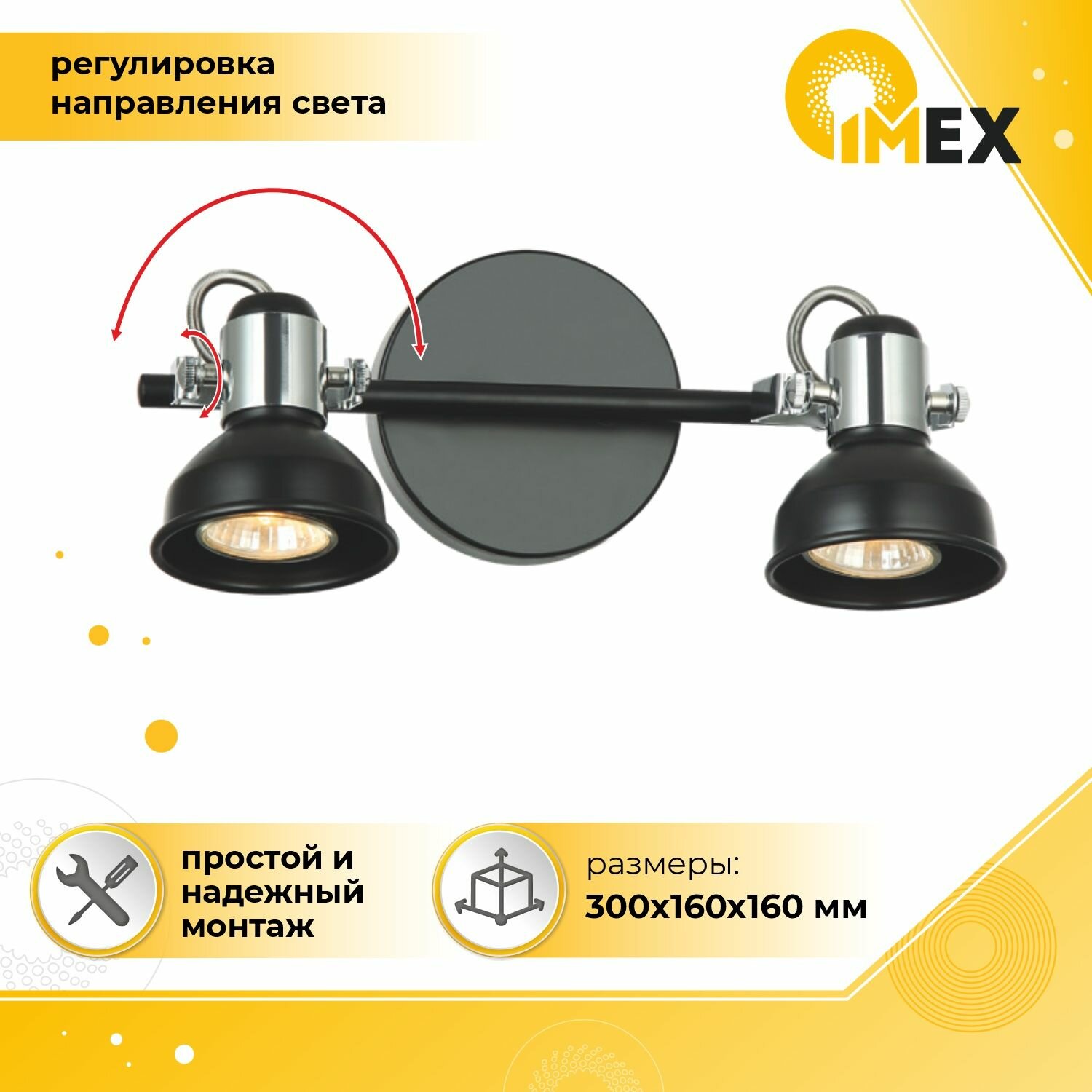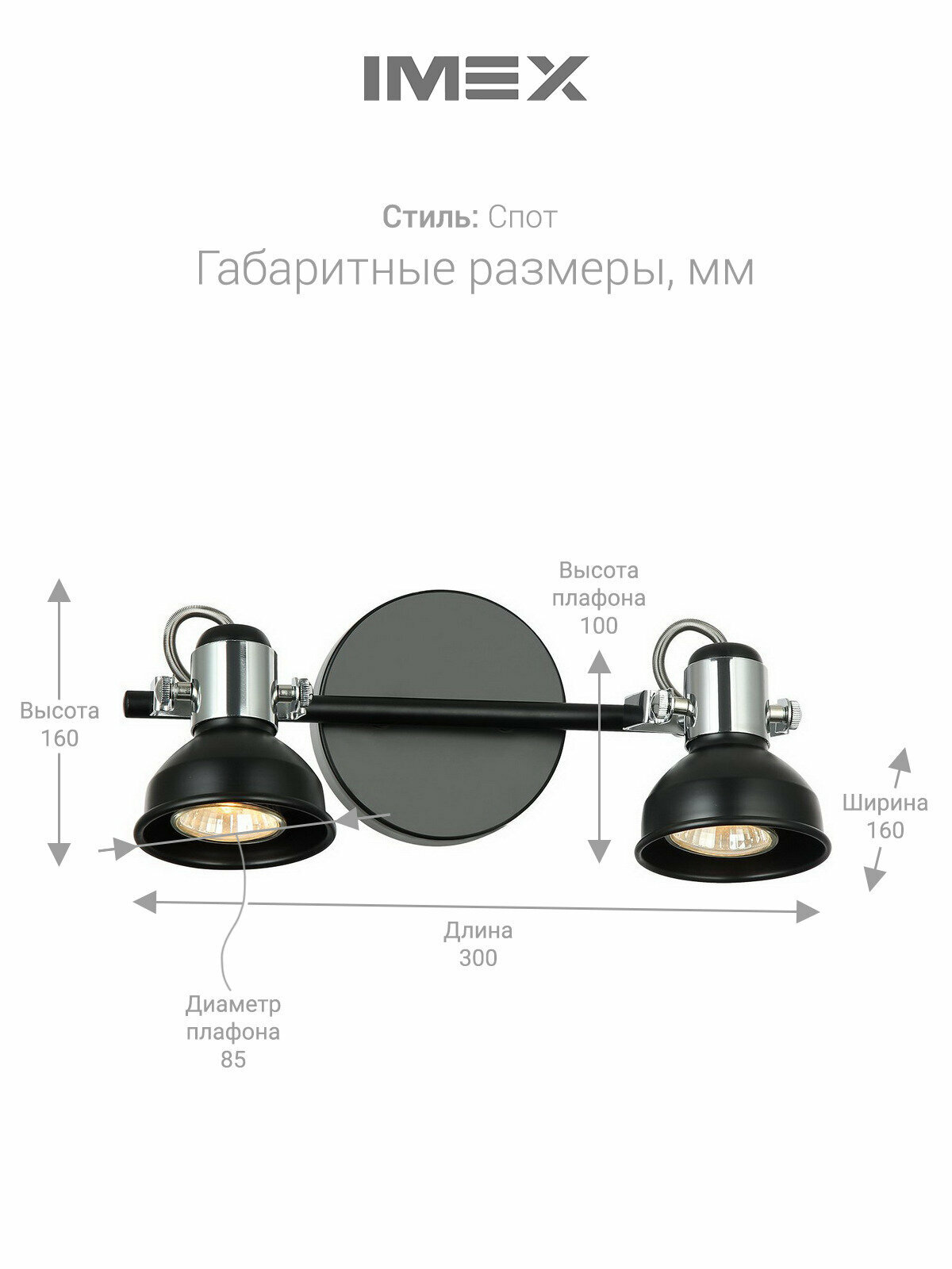 Спот - продукт известной компании Imex (Германия). Имеет максимальную мощность 100 Вт, освещает площадь до 7 кв. м. Отлично подойдет для таких мест, как гостиная, прихожая и коридор, спальня. Впишется в интерьеры следующих стилей: техно.