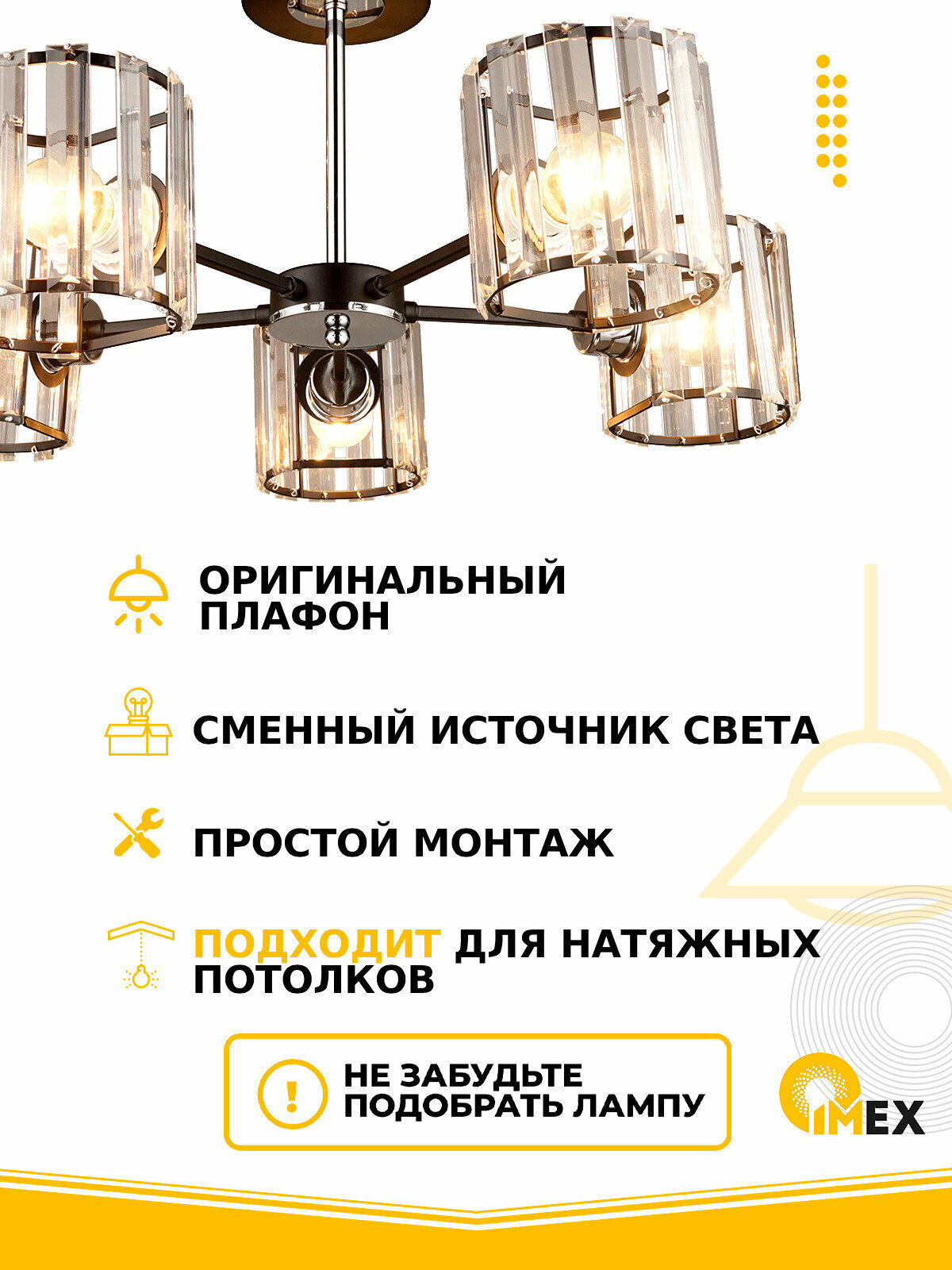 Потолочная люстра - продукт известной компании Imex (Германия). Имеет максимальную мощность 300 Вт, освещает площадь до 15 кв. м. Отлично подойдет для таких мест, как гостиная, спальня, кабинет, кухня. Впишется в интерьеры следующих стилей: модерн.