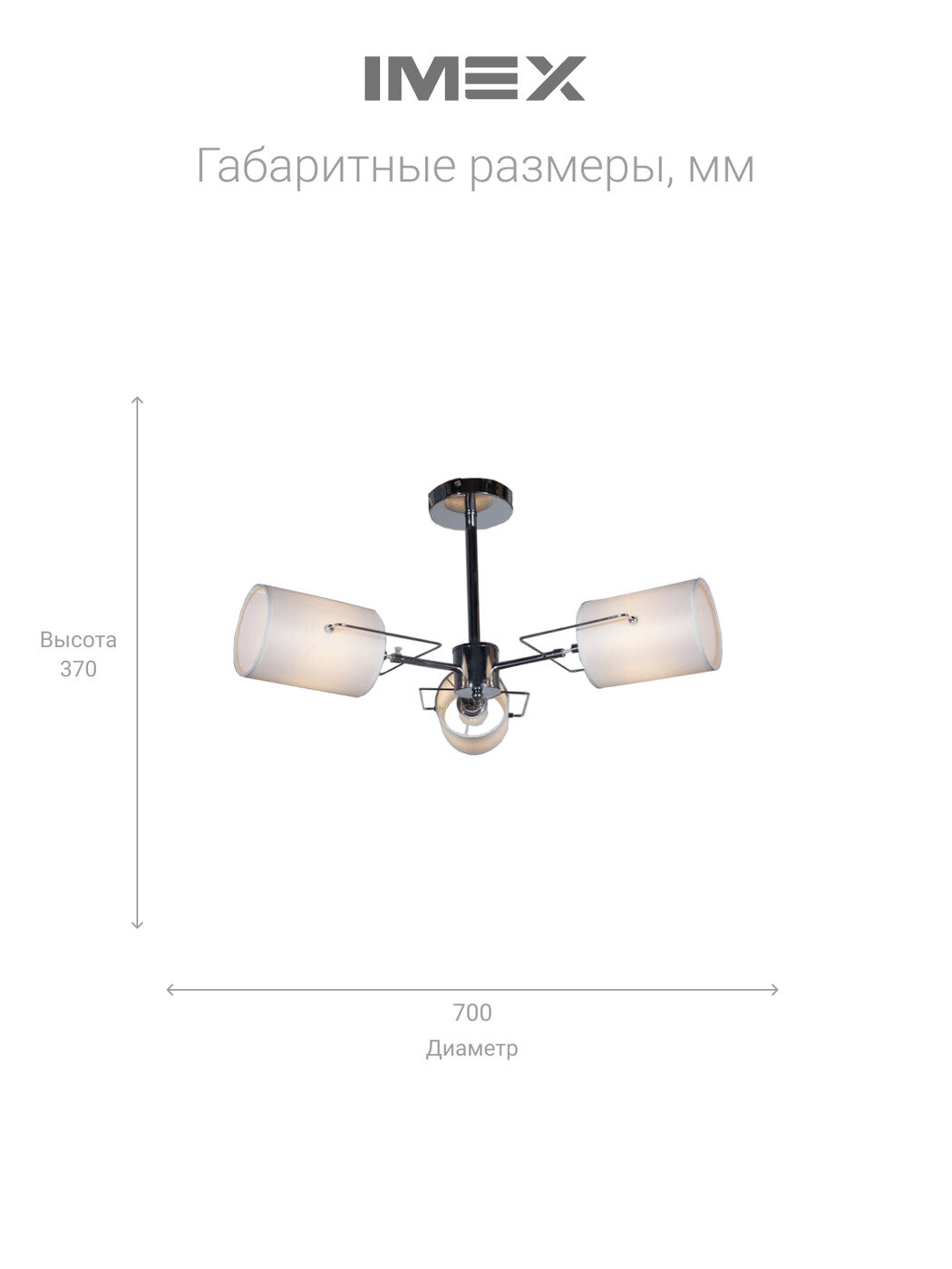 Потолочная люстра - продукт известной компании Imex (Германия). Имеет максимальную мощность 300 Вт, освещает площадь до 15 кв. м. Отлично подойдет для таких мест, как гостиная, спальня, кухня. Впишется в интерьеры следующих стилей: модерн.