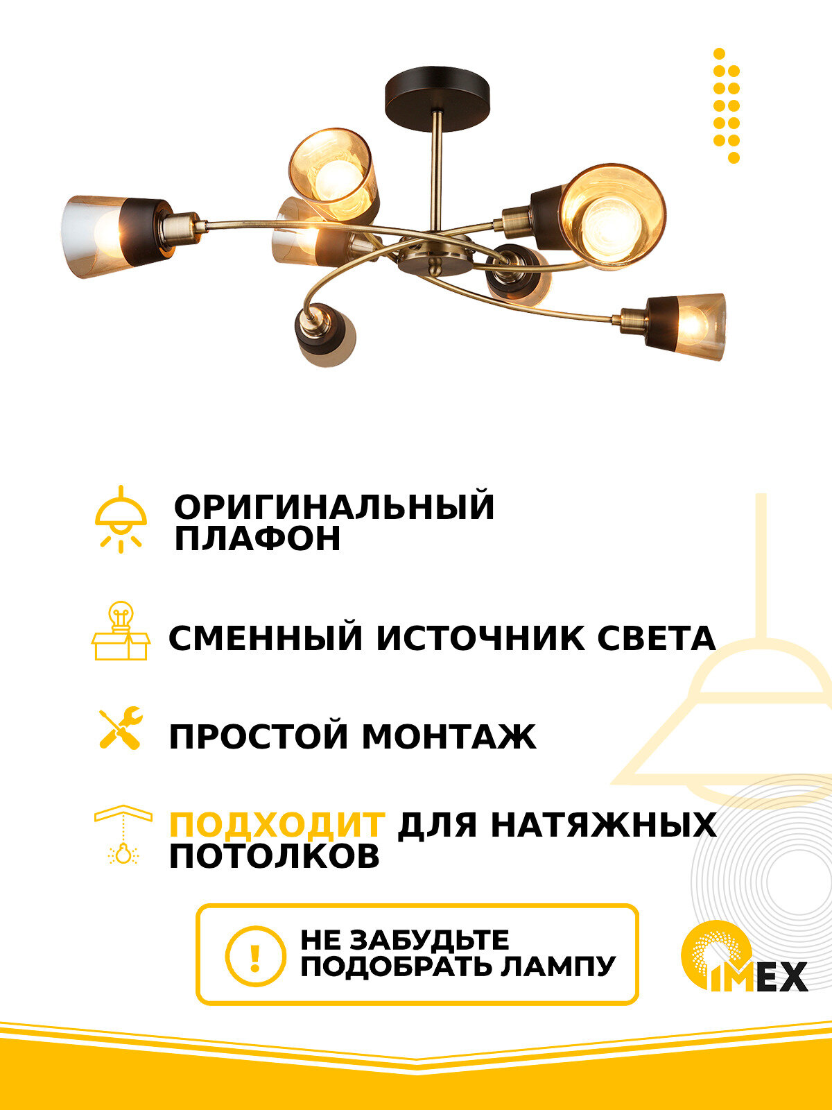 Потолочная люстра - продукт известной компании Imex (Германия). Имеет максимальную мощность 480 Вт, освещает площадь до 24 кв. м. Отлично подойдет для таких мест, как гостиная, спальня, кабинет, кухня. Впишется в интерьеры следующих стилей: модерн.